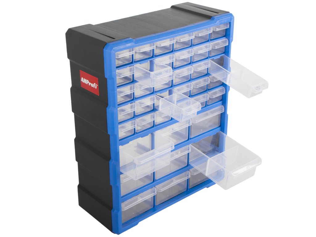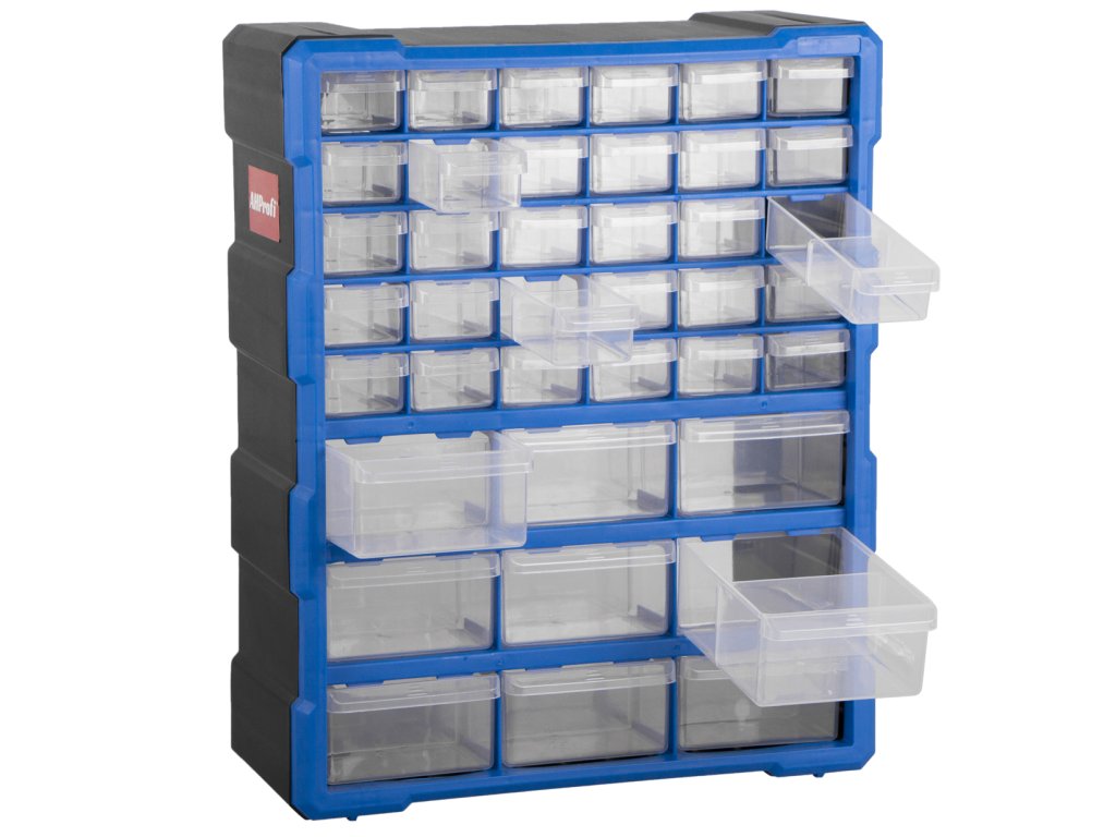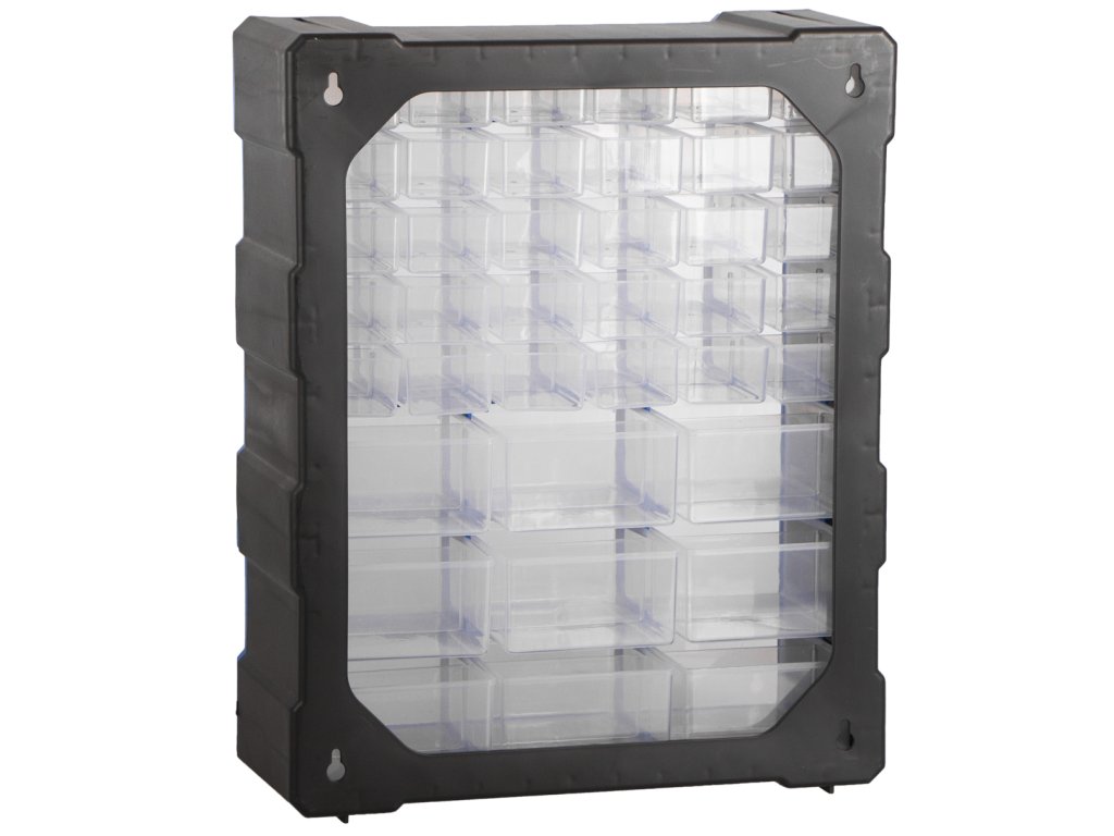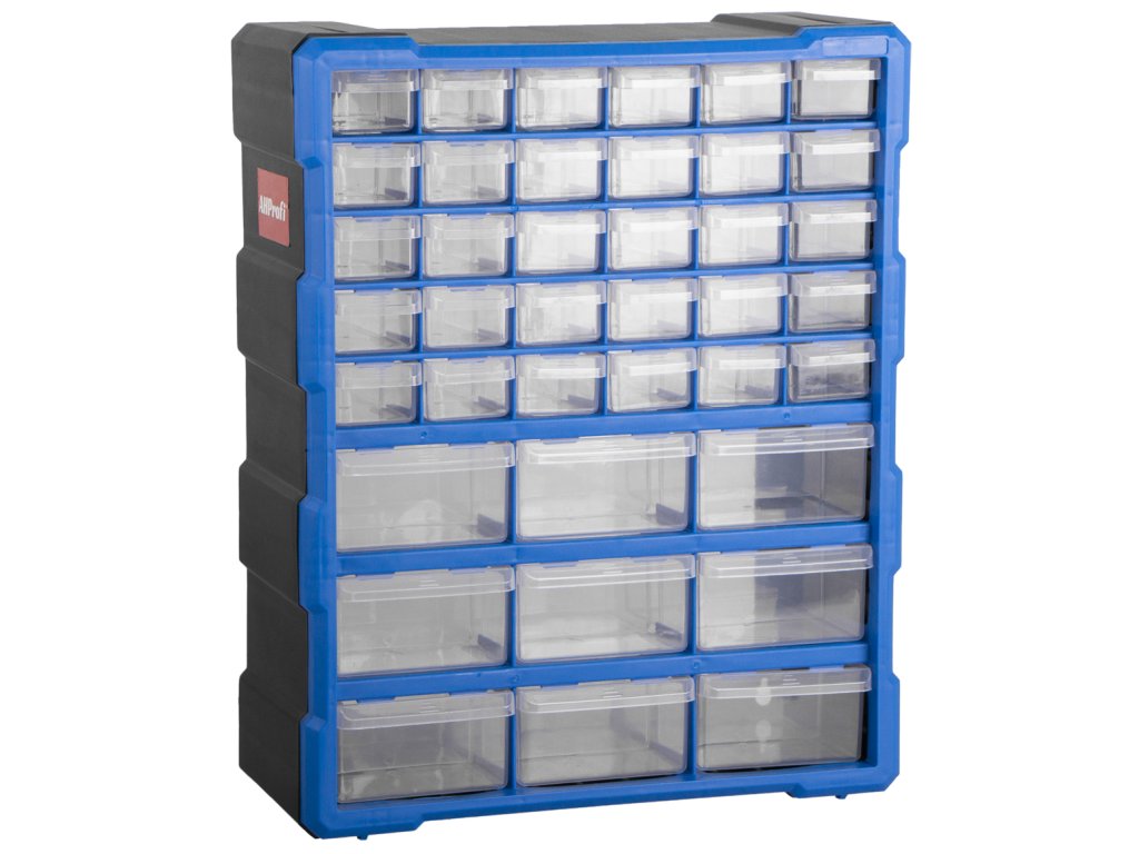 Plastový organizér s 39 zásuvkami lze jednoduše zavěsit na zeď, nebo např. z boku skříně, dílenského vozíku apod. Je možné ho postavit na ponk, nebo pracovní stůl a slouží pro uložení montážního materiálu a drobného dílenského vybavení.