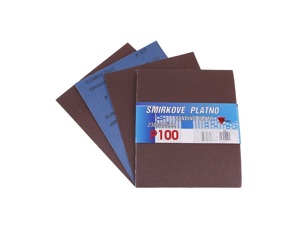 Smirkové plátno - sada 10 kusů, zrnitost: 100, druh zrna: oxid hlinitý, pojivo: syntetická pryskyřice, podkladový materiál : pružná tkanina-100% bavlna (240-260g/m2), rozměry : uvedeny v názvu výrobku, balení : 10 kusů - papírový návlek.Doplňkové parametry