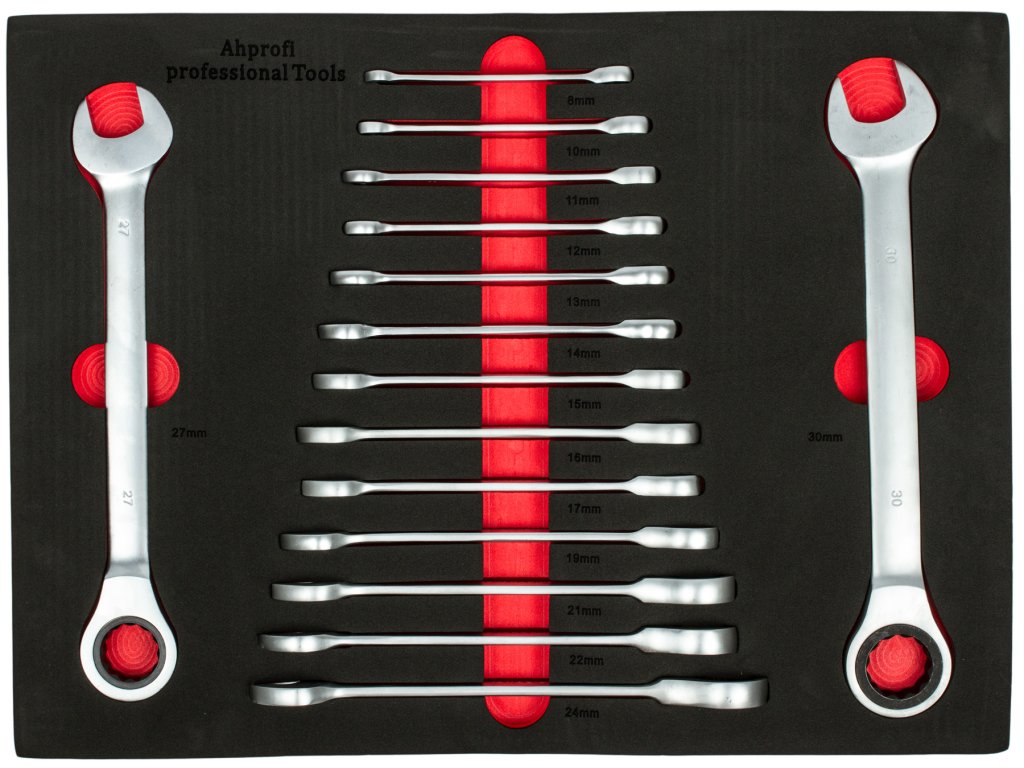 | 15 ks | Ráčnové očkoploché klíče: 8, 10, 11, 12, 13, 14, 15, 16, 17, 19, 21, 22, 24, 27 a 30 mm. |