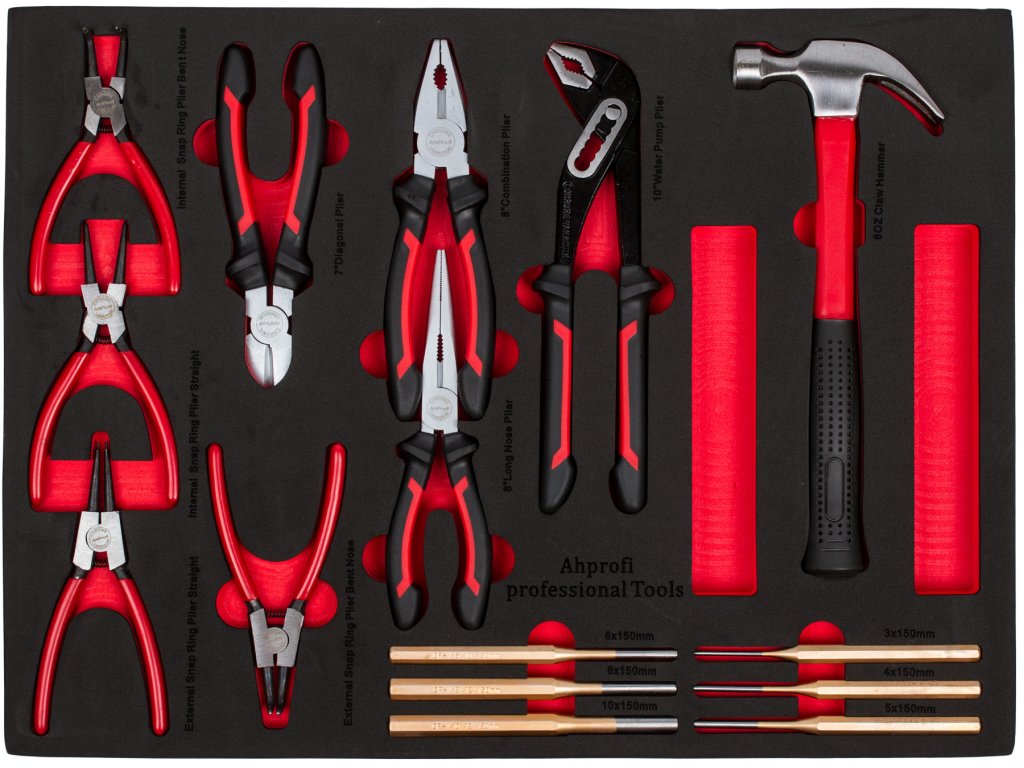 Nářadí se nachází v 5 ti pěnových výplních ve kterých každý kus nářadí má své přesné místo. Pěnovou výplň můžete klidně pověsit na zeď a stále v ní nářadí drží, na rozdíl od plastových výplní.