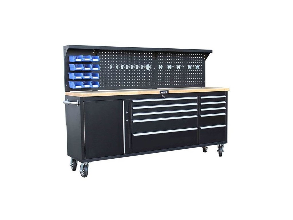 Profesionální dílenský pojízdný pracovní stůl/vozík s integrovanou zadní děrovanou deskou pro zavěšení nářadí.