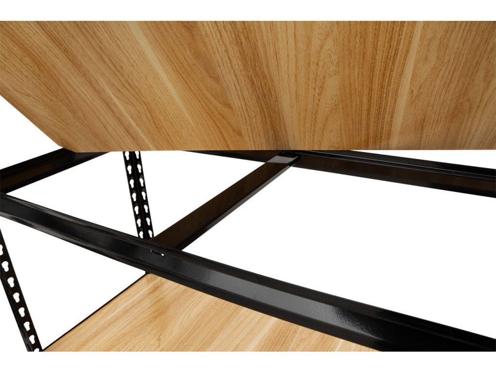 Bezšroubová konstrukce regálu umožňuje snadné a rychlé sestavení bez potřeby nářadí a spojovacího materiálu. Černý design s policemi v lesklém dřevodekoru dodávají regálu elegantní vzhled. Jeho zaoblené hrany zajišťují bezpečnost a dvě centrální podpěry na každé patro poskytují dodatečnou stabilitu.