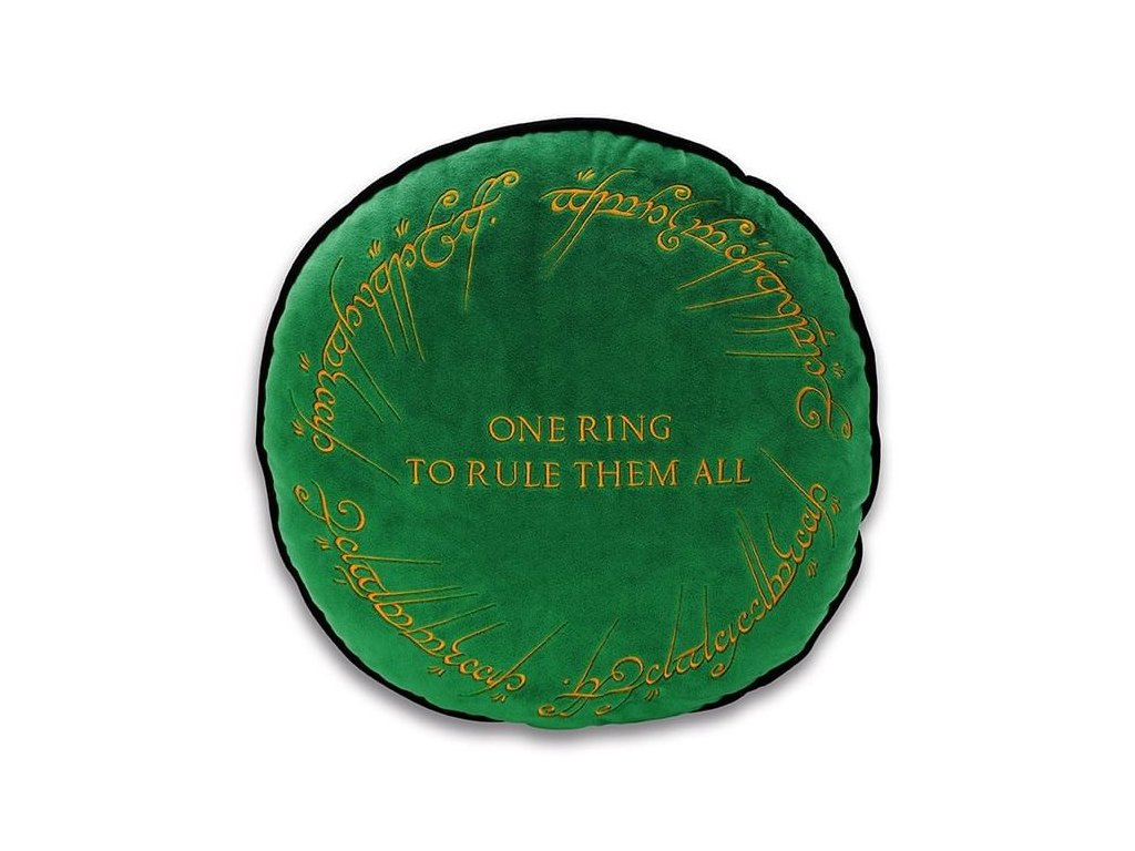 Zelený dekorační polštář s vyšitým nápisem z Prstenu moci. Pro ty, co nevládnou temným jazykem Mordoru, je přidán i text v angličtině: One ring to rule them all . Zadní stranu polštáře zdobí ikony z Pána prstenů - zlomený meč Narsil, bílý gondorský strom, Sauronovo oko a další.Doplňkové parametry