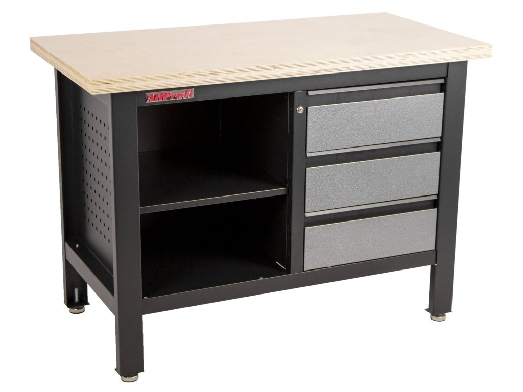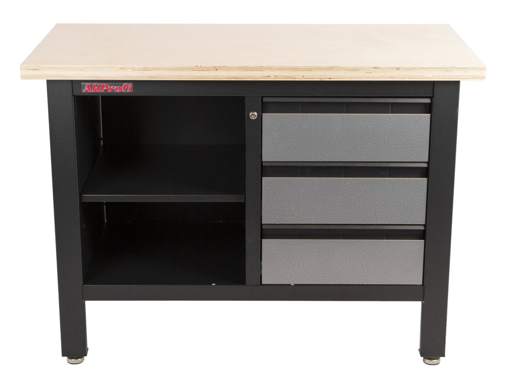 Stůl je vybavený dřevěnou pracovní deskou o rozměrech 1200 x 600 mm, policí a 3 uzamykatelnými šuplíky.