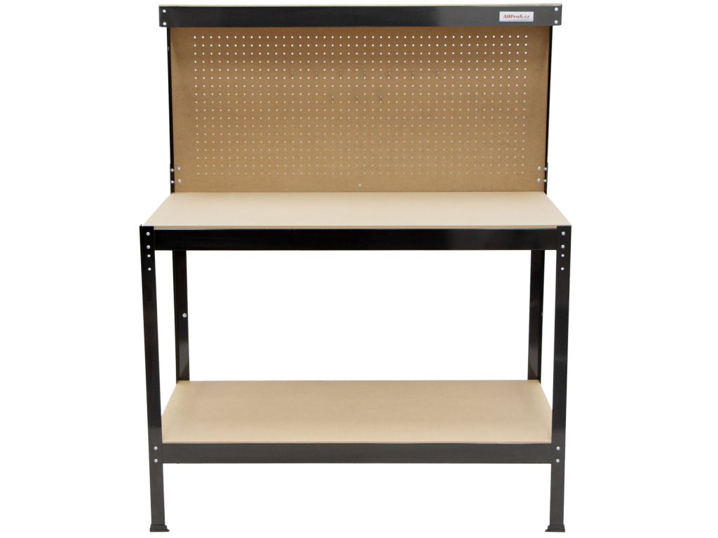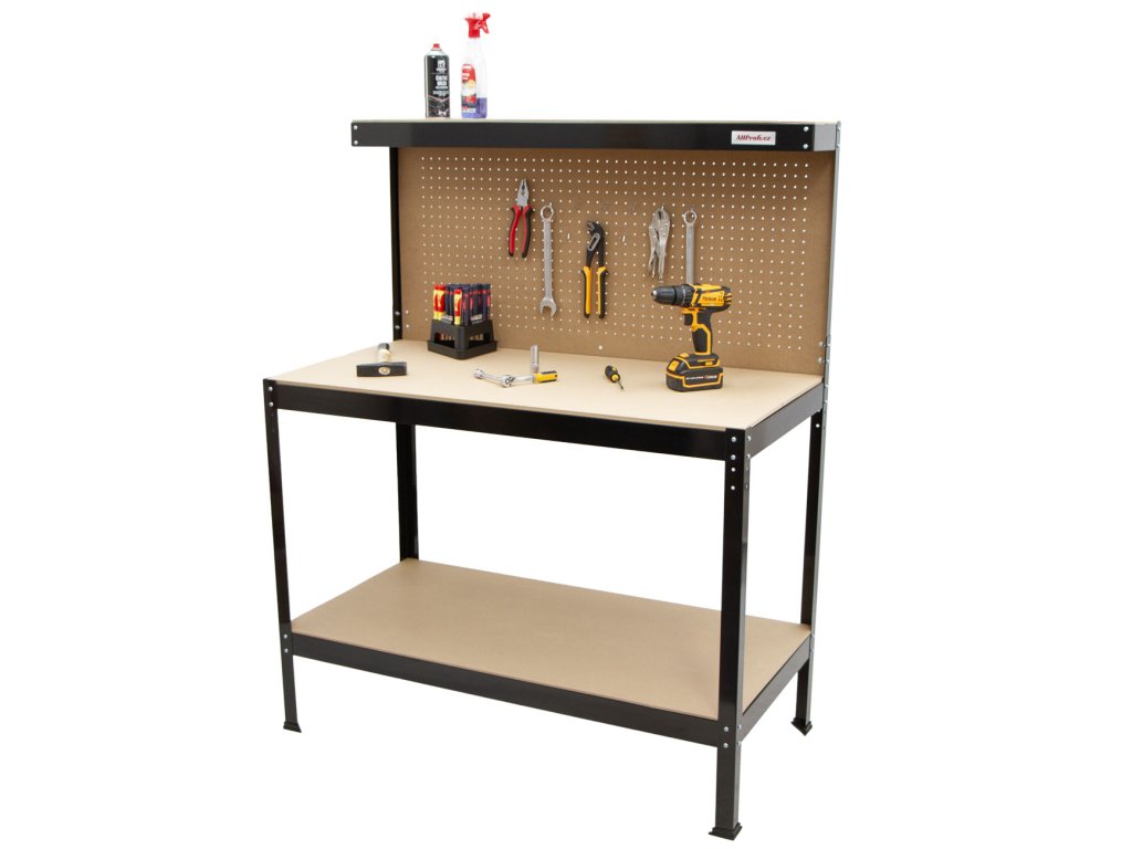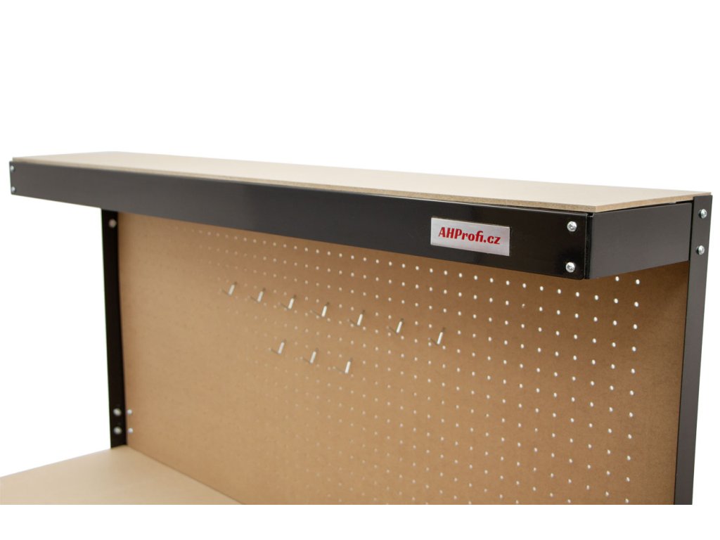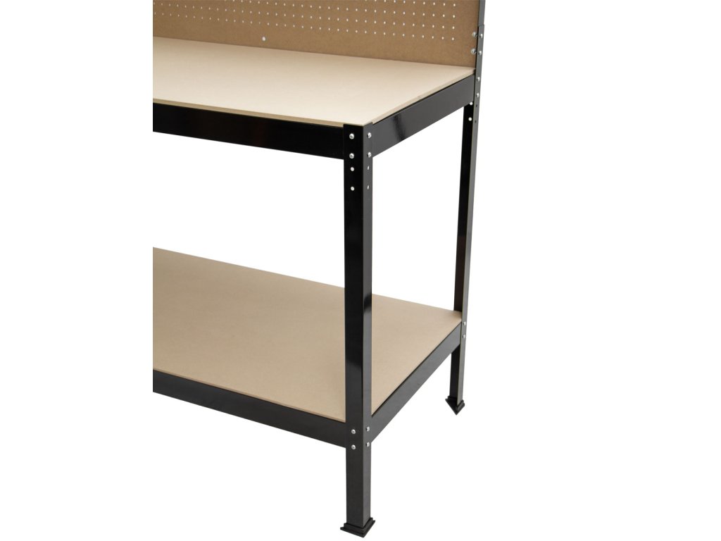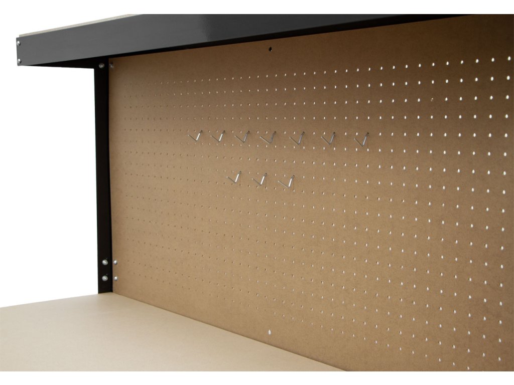 Součástí stolu je děrovaná zadní deska doplněná o 10 háčků pro přehledné zavěšení nářadí. Spodní police poskytuje úložný prostor pro větší vybavení.