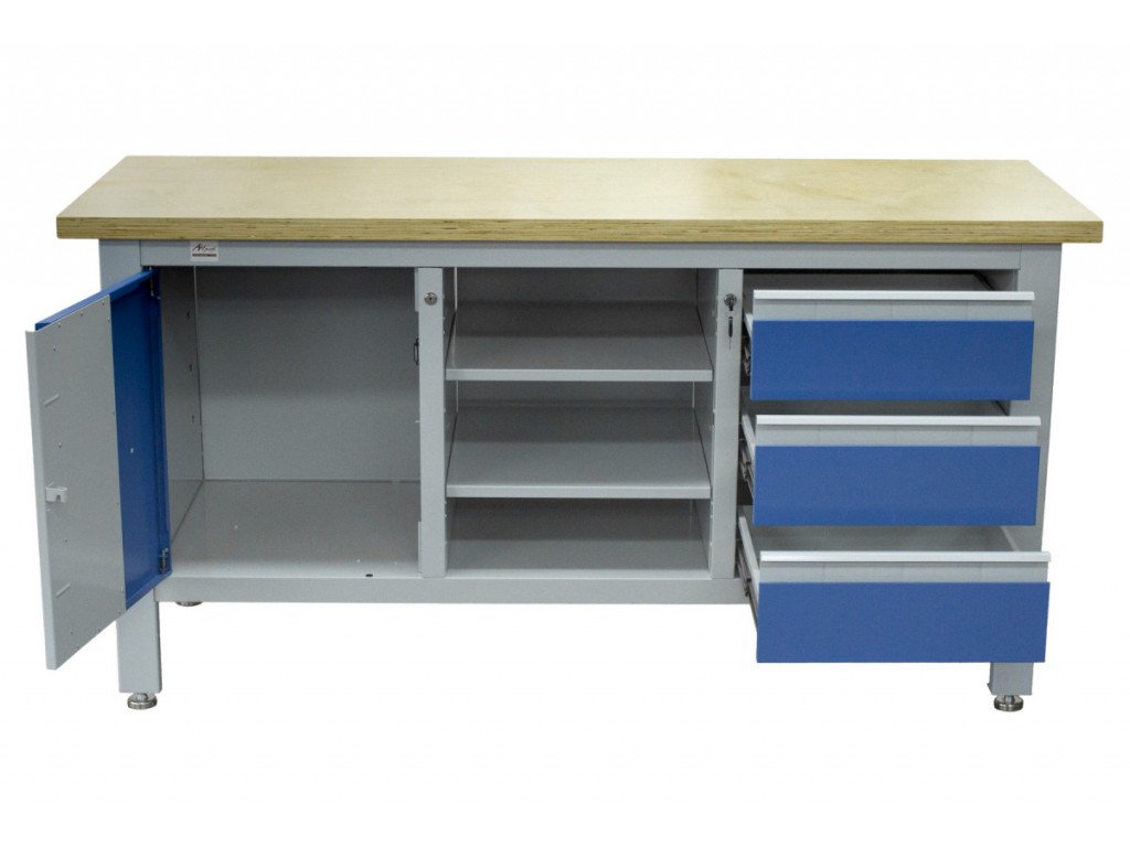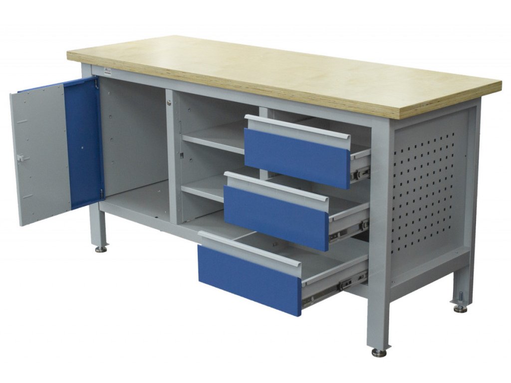 Stůl je vybavený dřevěnou pracovní deskou o rozměrech 1690 × 600 mm, uzamykatelnou skříňkou, 3 zásuvkami a 3 regály uprostřed ponku.