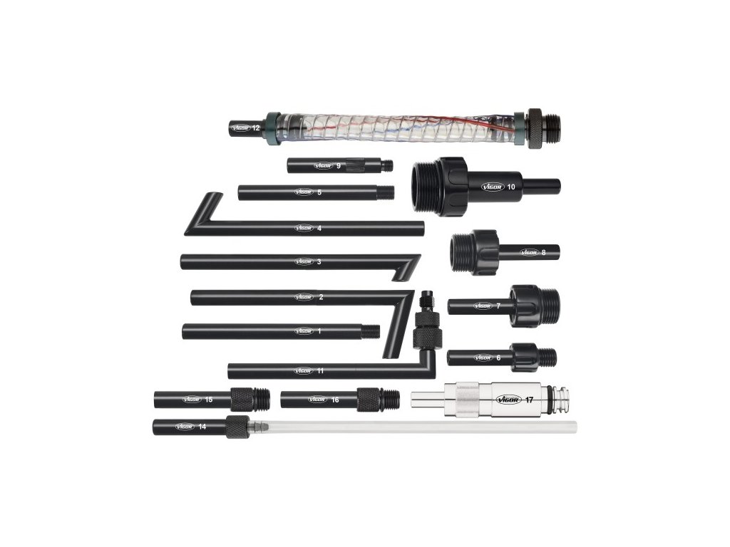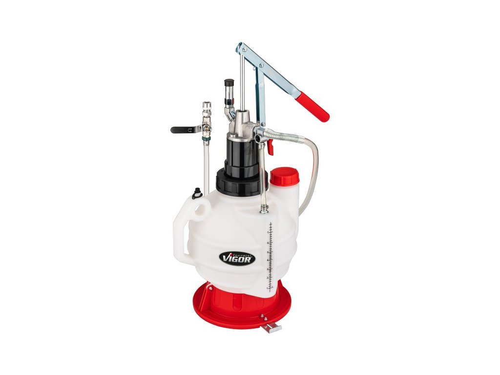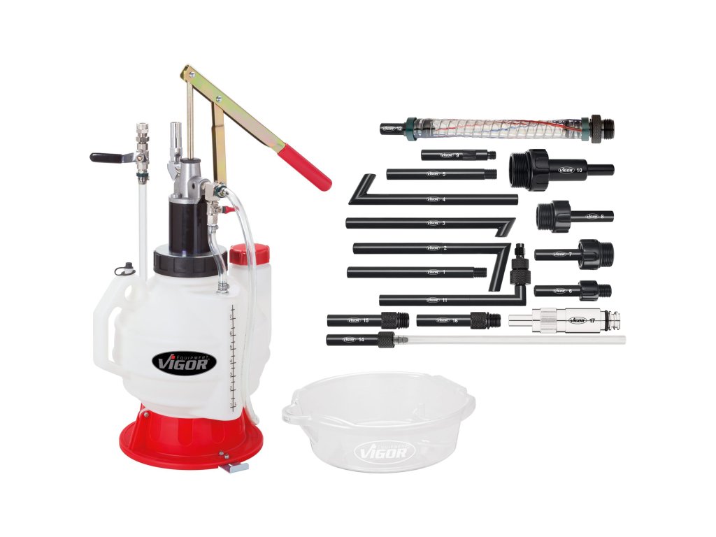 Ruční plnička s pákovým čerpadlem o objemu 7,5 l, 16 ks adaptérů a průhlednou hadicí o délce 1,6 m.