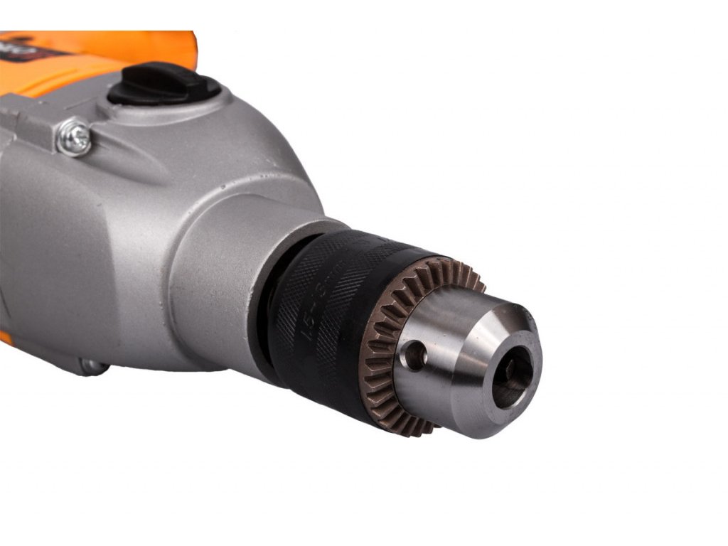 Rukojeť je osazena spouští s regulací otáček a aretací pro stálý chod. Snadno si tak upravíte rychlost otáček během práce. Nastavit lze až 19 stupňů rychlostí. Vrtačka je také vybavena zpětným chodem (levý/pravý chod) a je tak možné ji využít i při šroubování.