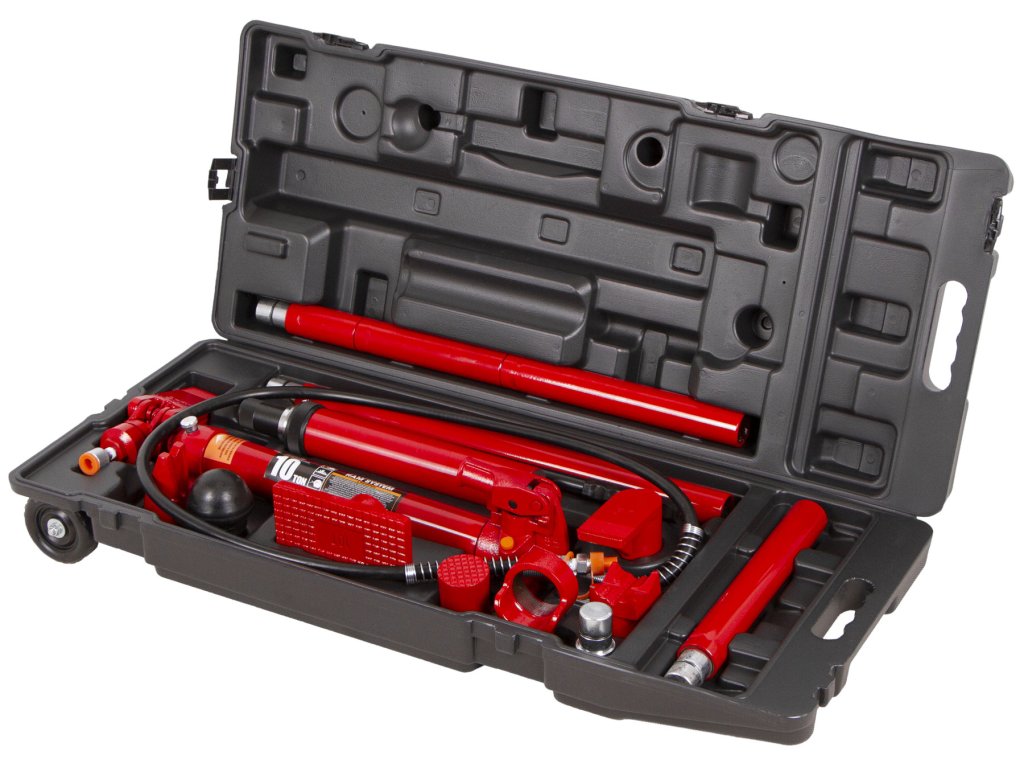 Konstrukci tvoří hydraulický válec se silou 10 tun a kvalitní příslušenství uložené v praktickém plastovém kufru s kolečky pro snadnou manipulaci.