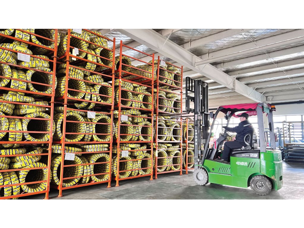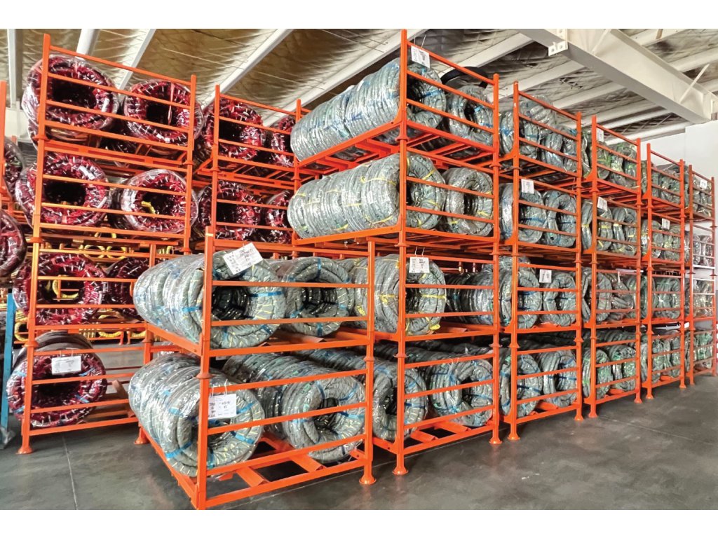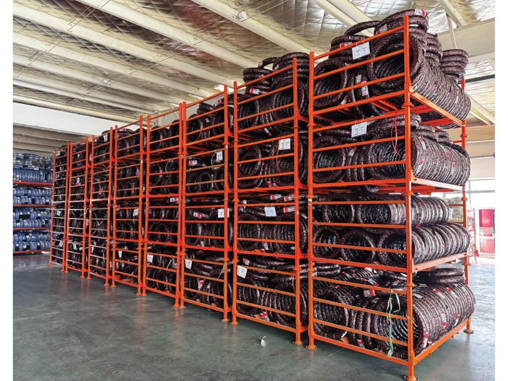Robustní ocelový regál na skladování pneumatik osobních nebo dodávkových automobilů.