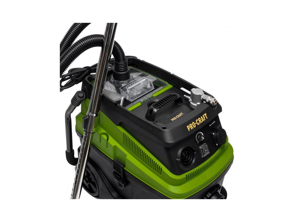 Průmyslový vysavač Procraft VP2000 je určen k mokrému i suchému vysávání. Je možné ho použít na staveništích, dílnách truhlářských a lakovacích provozech, ale i jako domácí vysavač, nebo k vysávání auta. Je vhodný pro odstraňování třísek, pilin a sádrového prachu. Vysavač má 4 m sací hadici a telekopicky nastavitelnou ocelovou trubku Silný motor s příkonem 1600 W zaručuje vysoký sací výkon o 18kPa a dokáže tak účině vysát prach ze strojů a těžší nečistoty ze stavby. Poradí si s rozlitou vodou, kterou vysává do nádoby (čištění koberců). Plynulou regulace sací síly, manuální oklep prachových filtrů. Rychloupínací spony usnadní výměnu pytlů. Automatický systém zapínání integrovanou zásuvkou 230V včetně funkce doběhu usnadní práci. Vysavač je dobře pojízdným díky kombinaci dvou velkých kol a dvou otočných, vybaven pohodlnou rukojetí pro přenášení. Součástí dodávky je odsávací hadice, hepa filtr, teleskopická kovová trubka, hubice, sáčky a kola. Balení karton.