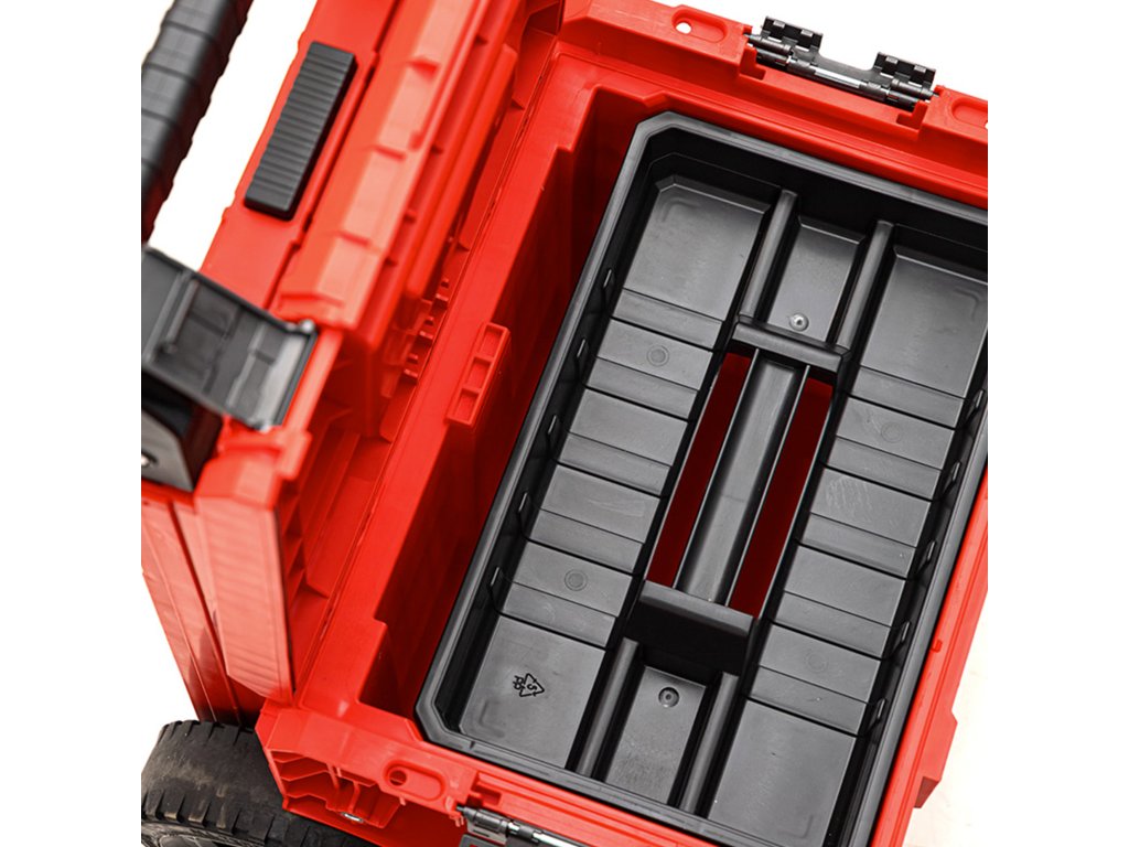 Praktický přepravní box na kolečkách navržený pro profesionální použití. Disponuje odnímatelnou teleskopickou rukojetí ve dvojitém provedení a integrovanou opěrkou pro nohu, což umožňuje stabilní držení a snadné ovládání i na omezeném prostoru. Devítipalcová kola o šířce téměř 6 cm jsou opatřena silnou gumovou vrstvou, která zaručuje spolehlivý pohyb i v náročném terénu. Robustní zámky a boční spojovací prvky z vysoce odolného polyamidu přispívají k bezpečné přepravě nářadí. Celá konstrukce je navržena tak, aby odolávala prachu i vodě, díky pružnému těsnění integrovanému ve víku.Doplňkové parametry
