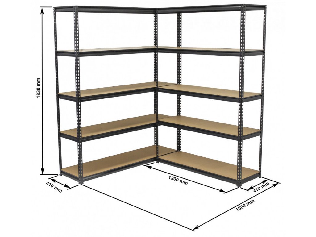 Regálový systém obsahuje klasický rovný regál o šířce 1500 mm a regál o šířce 1200 mm s výškou 1830 mm.