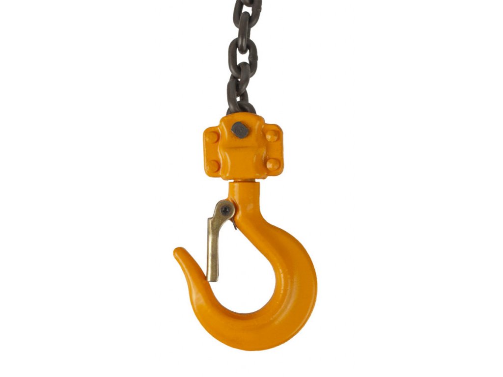 Robustní a pevná ocelová konstrukce se závěsným hákem s pojistkou, obslužným řetězem o průměru 4,8 mm a 3 m dlouhým pozinkovaným zdvihacím řetězem o průměru 6 mm z legované pozinkované oceli.