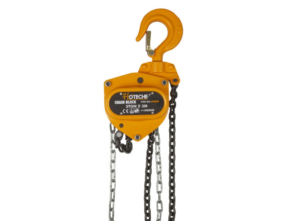 Přenosný řetězový kladkostroj (kočka) od značka Hoteche, určený pro svislé zvedání břemen do maximální váhy 2000 kg.