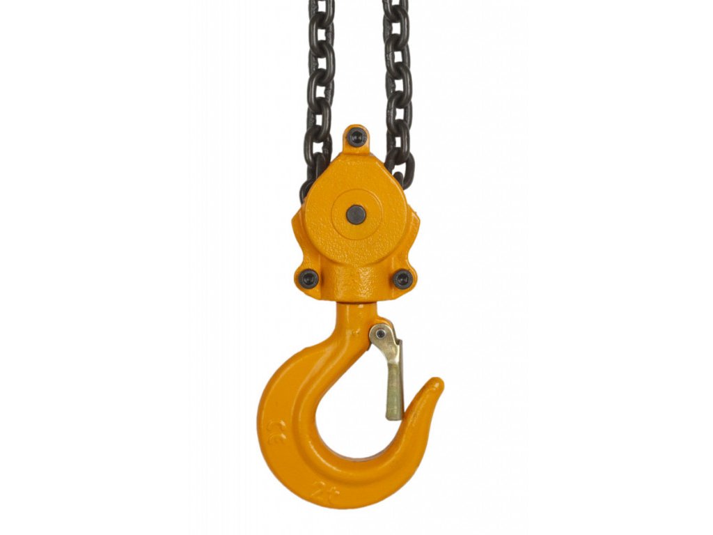 Robustní a pevná ocelová konstrukce se závěsným hákem s pojistkou, obslužným řetězem o průměru 4,8 mm a 3 m dlouhým pozinkovaným zdvihacím řetězem o průměru 6 mm z legované pozinkované oceli.