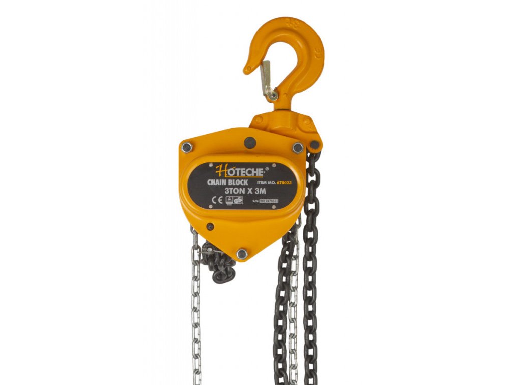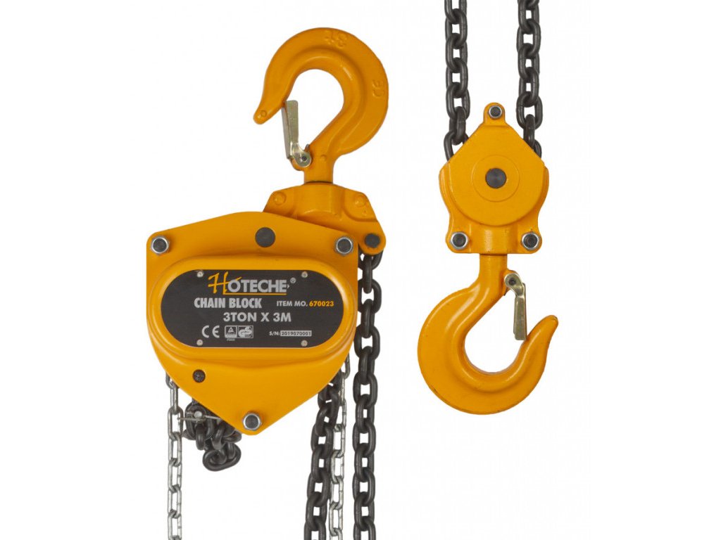 Přenosný řetězový kladkostroj (kočka) od značka Hoteche, určený pro svislé zvedání břemen do maximální váhy 3000 kg.