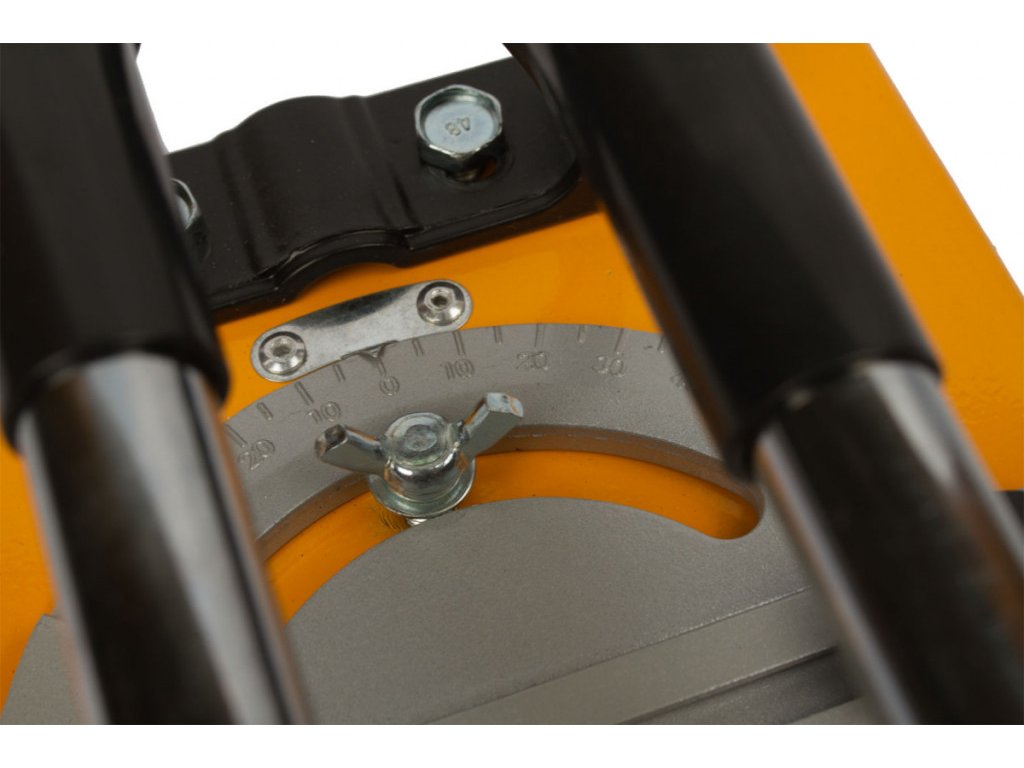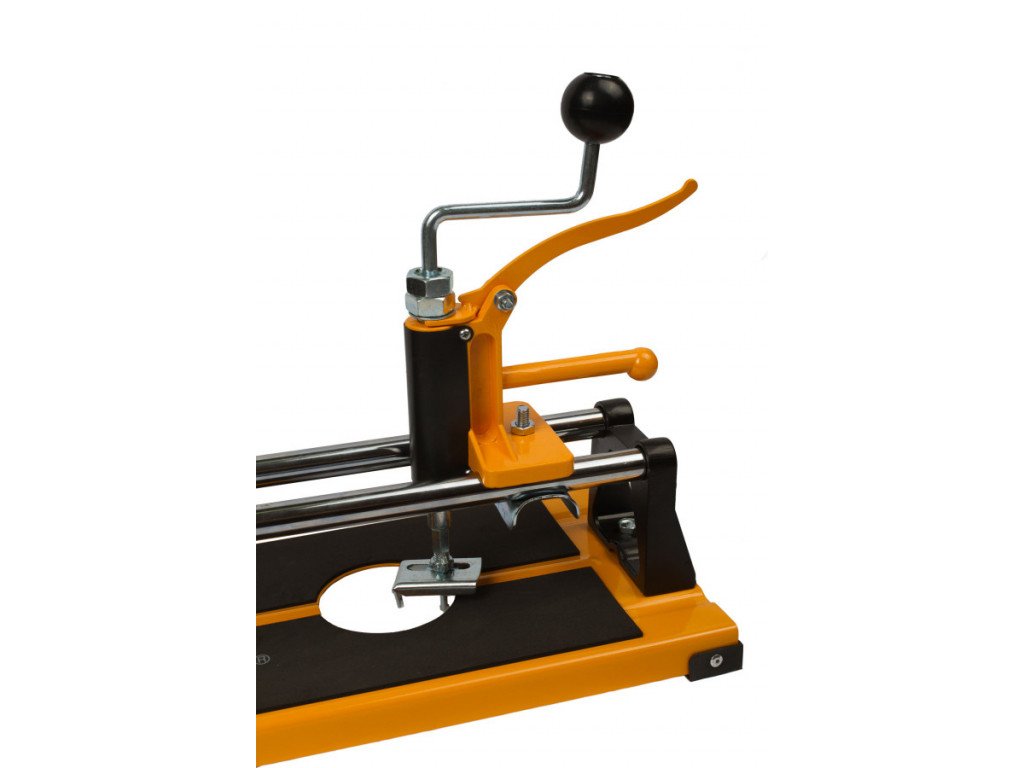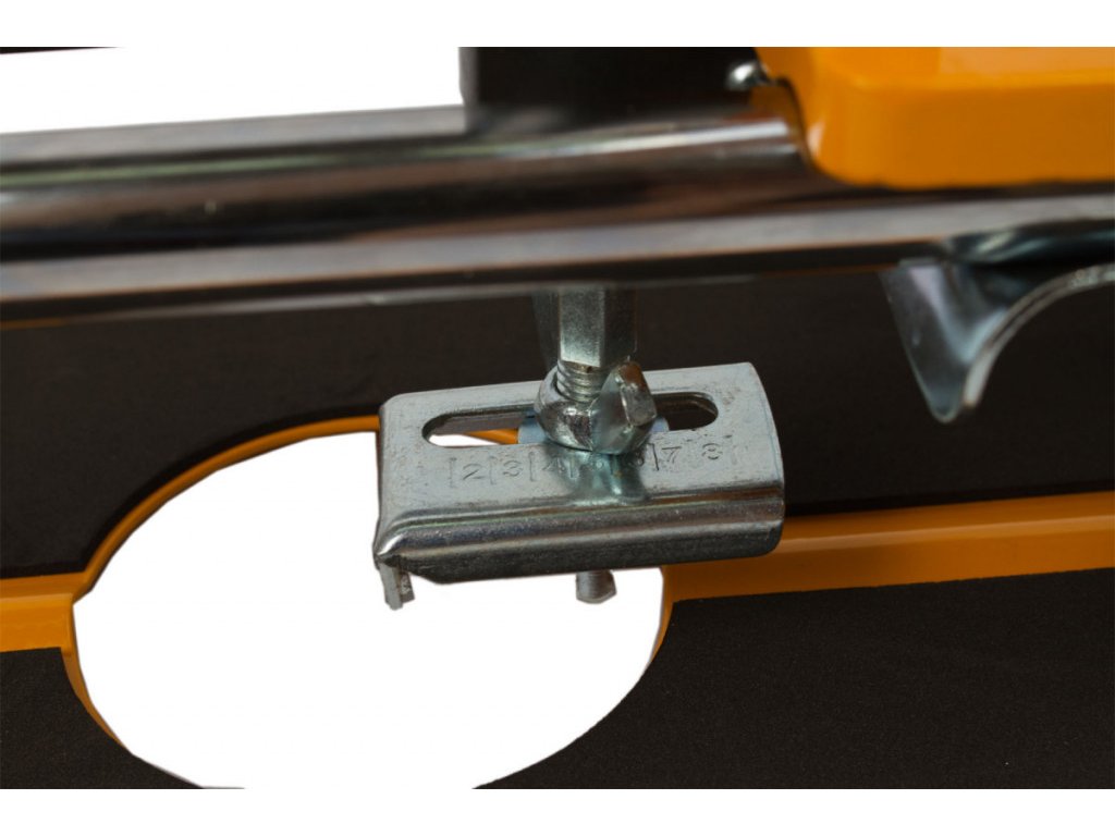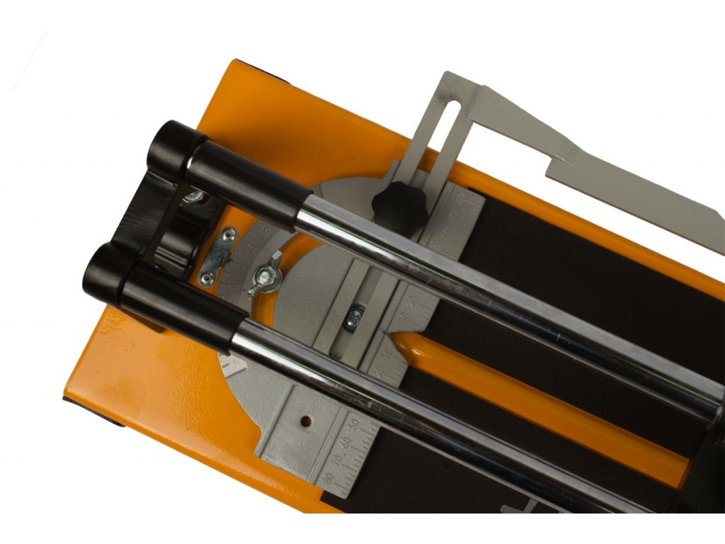 Dosedací plocha je ošetřena molitanem, který zabraňuje posunu dlaždice při řezání a zabraňuje tak možnému poškrabání, nebo nepřesnému provedení řezu. Dvojitá ocelová kolejnice je zárukou stability pro provedení přesného a rovného řezu. Posuv řezné hlavy je zajištěn čtyřmi kluznými plastovými ložisky. Práci Vám usnadní i zabudované plastové měřítko.