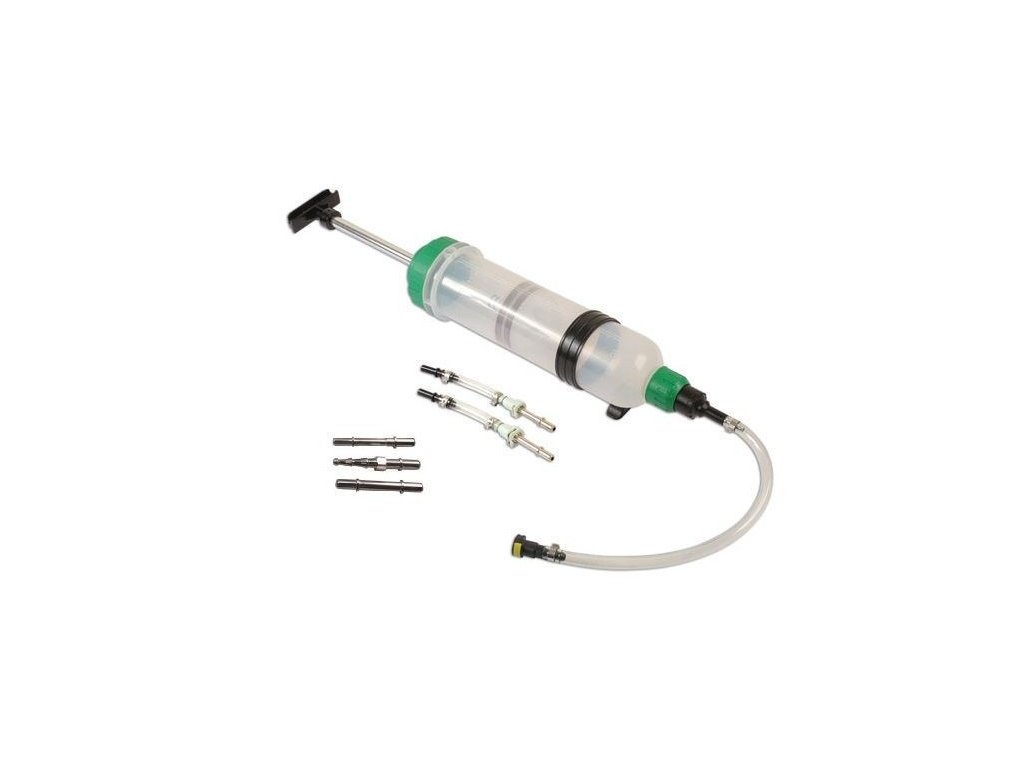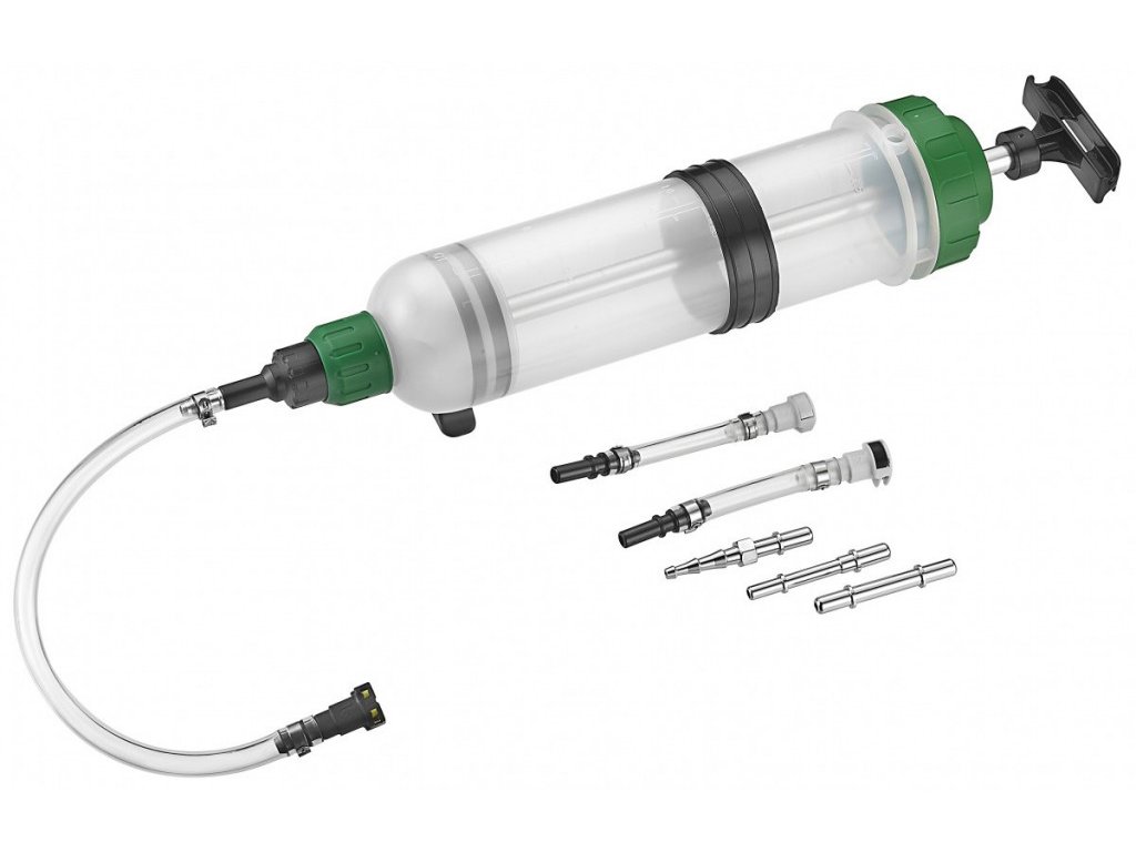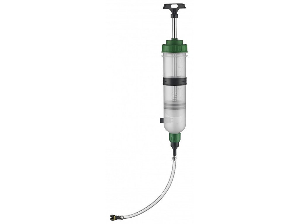 - Ruční plnička a odsávačka nafty a benzínu typu injekční stříkačka s obsahem zásobníku 1,5 l.