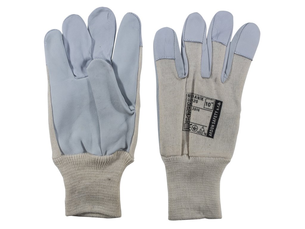 Kombinované rukavice "mechanik", dlaň z jemně činěné tříděné lícové jehnětiny, hřbet z bavlněného bílého úpletu s pružnou pletenou manžetouDoplňkové parametry