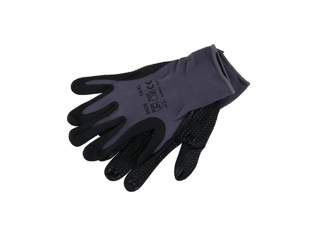 Šedý úplet z jemného nylonu, dlaň máčena v kvalitní nitrilové pěně s terčíky na dlani, CE EN 388, velikost 10.Doplňkové parametry