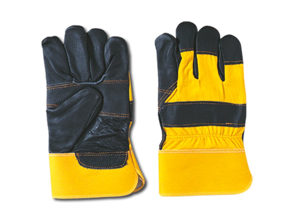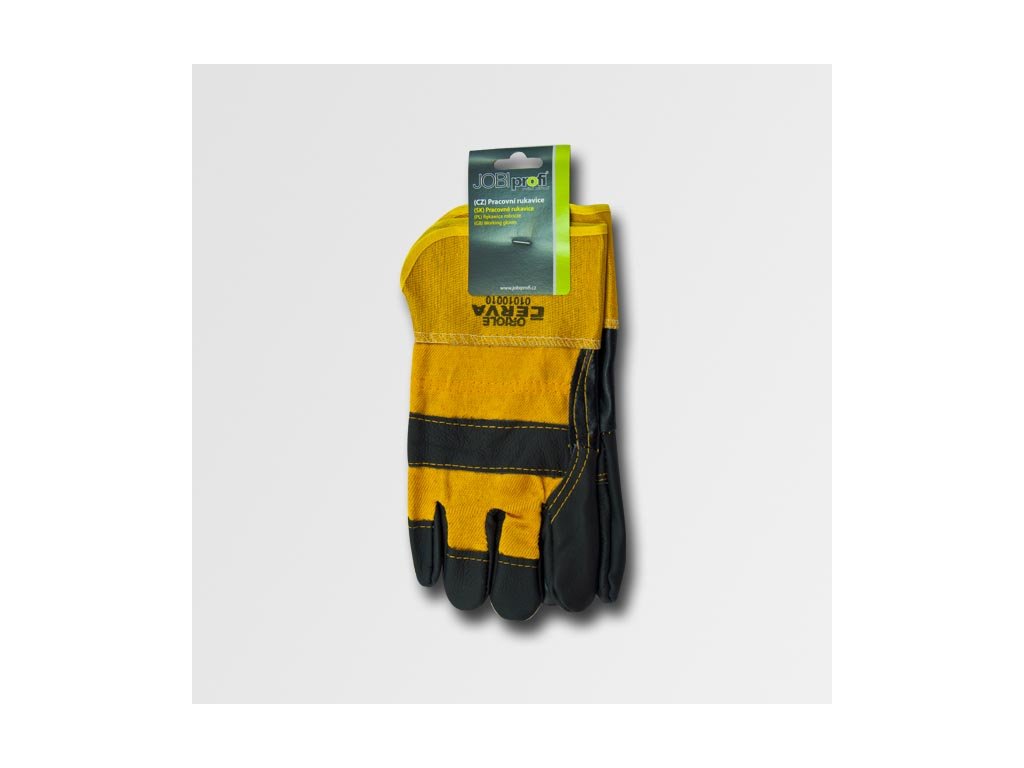 Dlaň z tmavé jednobarevné lícové nábytkové hověziny, hřbet a tuhá manžeta ze žluté bavlněné tkaninyDoplňkové parametry