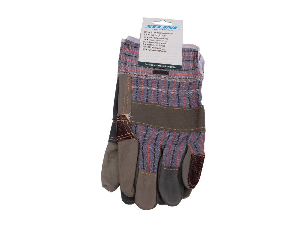 Kombinované rukavice, dlaň z různobarevné lícové nábytkové hověziny, hřbet a manžeta z pruhované bavlněné tkaniny, podšívka ve dlani.Doplňkové parametry
