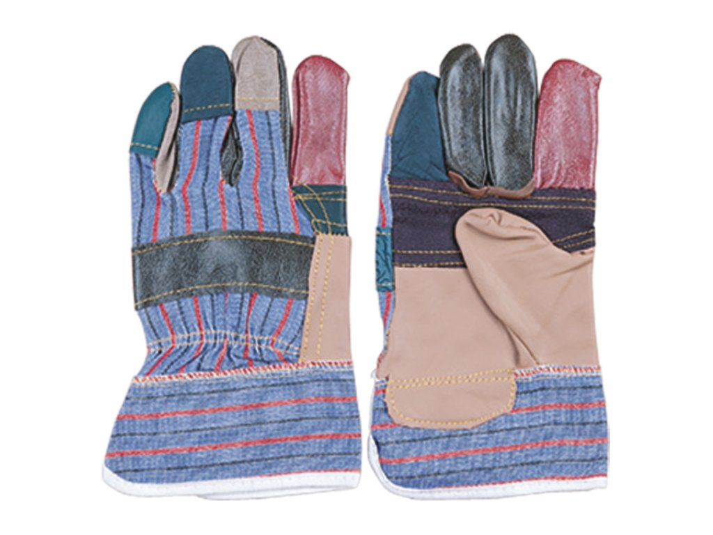 Kombinované rukavice, dlaň z různobarevné lícové nábytkové hověziny, hřbet a manžeta z pruhované bavlněné tkaniny, podšívka ve dlani.Doplňkové parametry