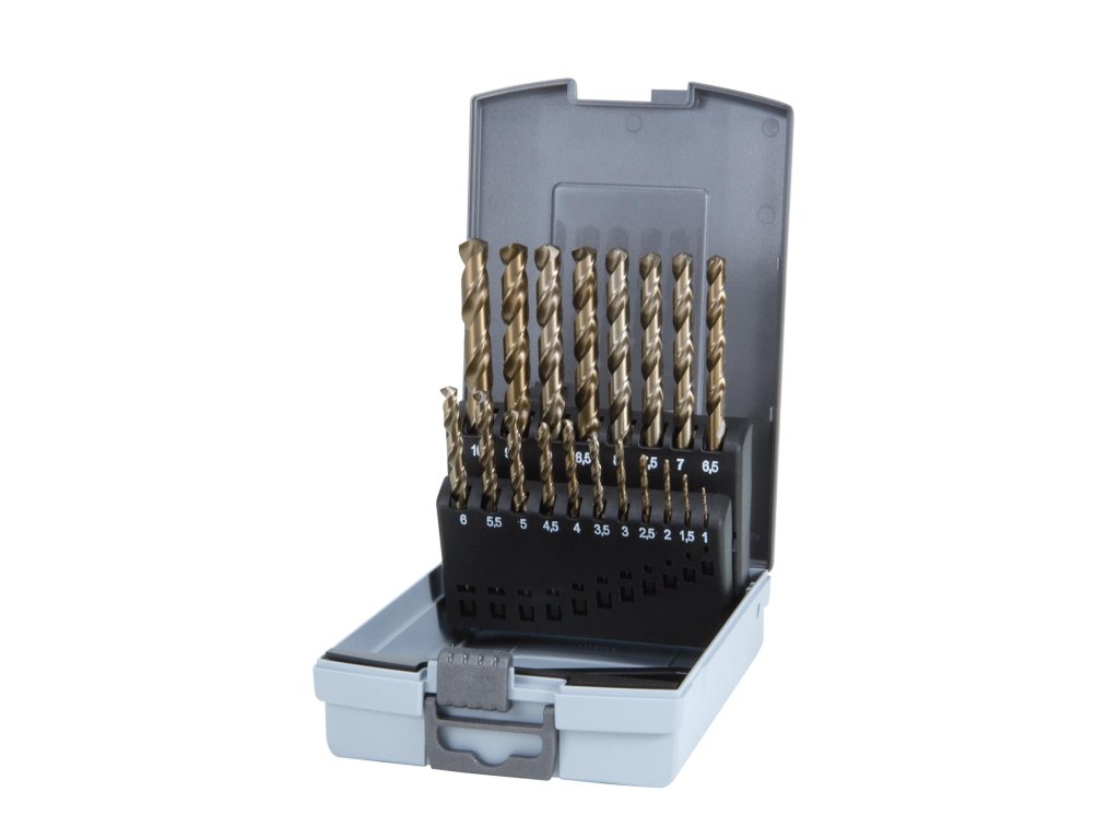 Sada 19 šroubovitých vrtáků DIN 338 typu N. 1-10 mm v řadě po 0,5 mm. Vrtáky jsou uloženy v plastovém boxu.Doplňkové parametry