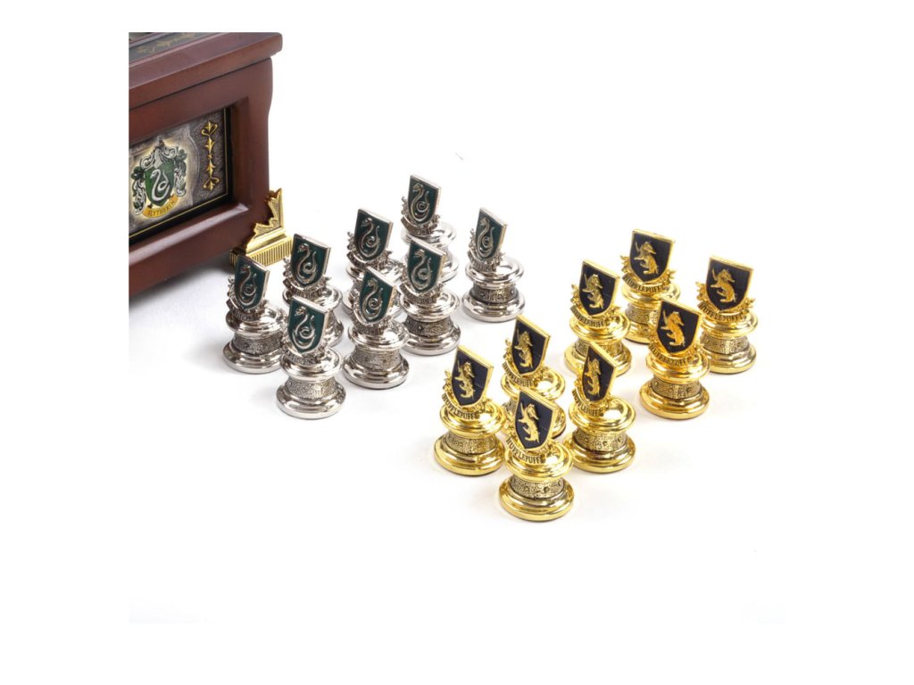 Působivá šachová souprava obsahující figurky z oblíbené sportovní hry famfrpál objevující se v literárním a filmovém zpracování Harryho Pottera. Sada umožňuje hrát za některou ze školních kolejí nacházející se v Bradavicích - za Nebelvír, Zmijozel, Mrzimor nebo Havraspár. Šachový komplet tvoří bytelná skříňka, která je sama o sobě uměleckým počinem. Je vyřezaná z kvalitního dřeva, s pozlacenými detaily. Po stranách ji zdobí různé ornamenty a detailně vyobrazené erby všech čtyř univerzitních kolejí. Samotné šachové figury představují různé vybavení a předměty typické pro famfrpálové zápasy. Každá z hracích figur je v podstatě soškou reprezentující vybranou kolej. Před vámi se tak v napínavém zápase utkávají například Zlatonka, Potlouk, Camrál, hrací hole či samotný pohár pro vítěze. Mistrovsky navržená šachovnice s figurami potěší všechny sběratele, nadšené fanoušky kouzelnického světa vytvořeného spisovatelkou J. K. Rowlingovou a sběratele jedinečných šachových kompletů.Doplňkové parametry
