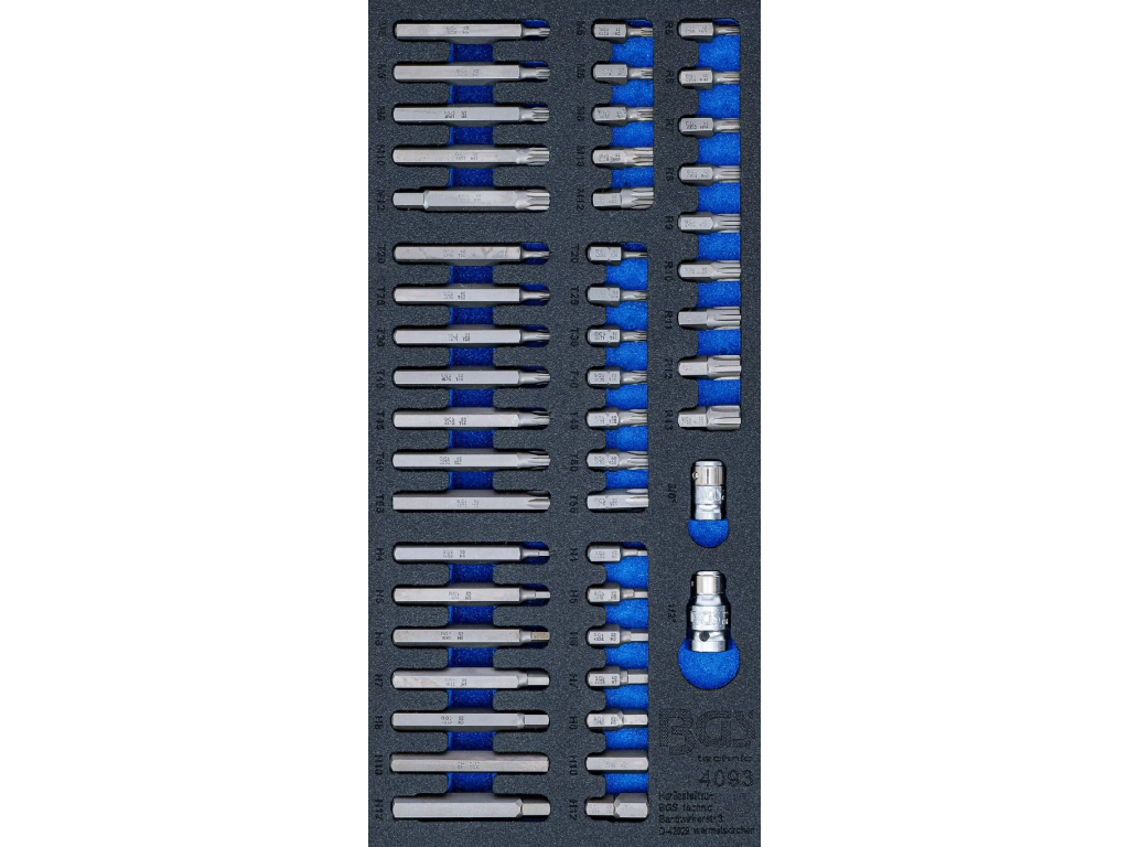 Pěnová vložka o rozměrech (š x h x v) 189 x 408 x 32 mm obsahuje celkem 49 ks bitů Imbus, Torx, RIBE a XZN.