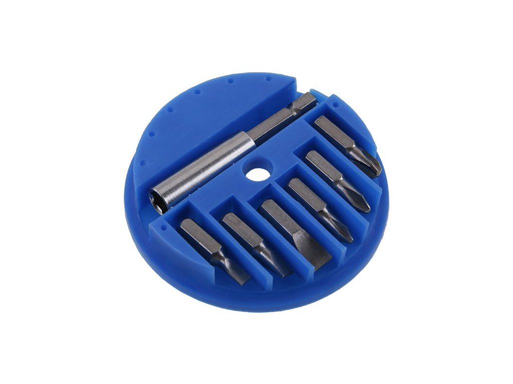 Bity v plastové kruhové krabičce s otvorem pro vysunutí potřebného bitu. Sada obsahuje 7 ks s manetickými hroty( - 3,5,7 + PH1,PH2PH3). Pro hobby použití.Doplňkové parametry