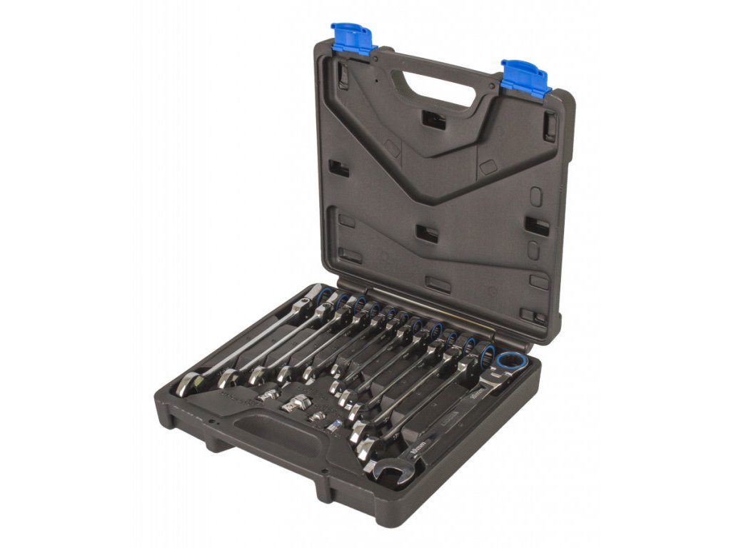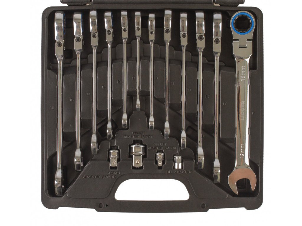 Kompletní sada 16 očkoplochých ráčnových klíčů s otočnou hlavicí, ideální pro práci v těžko přístupných místech.