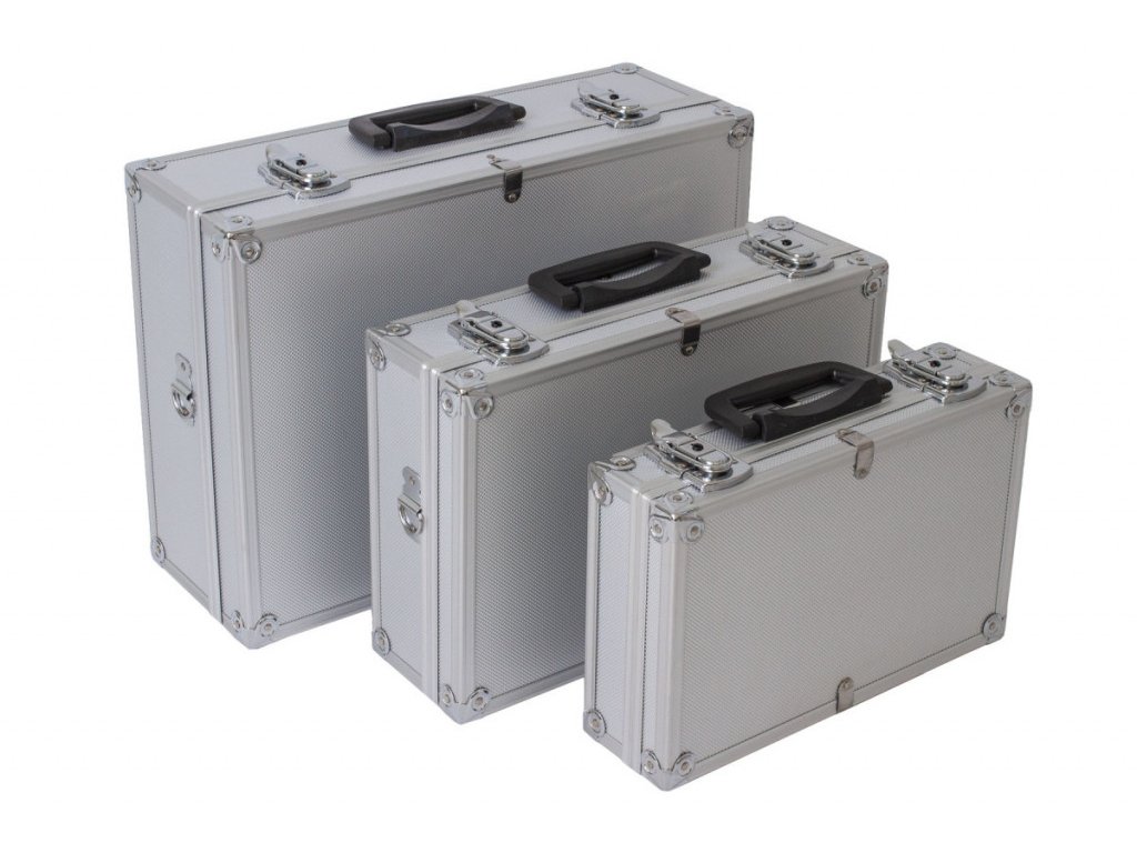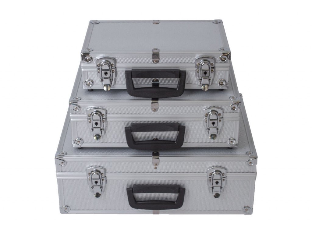 Sada tří hliníkových kufrů, které lze uskladnit do sebe. Kufry jsou lehce přenosné díky madlům. Ke dvou větším kufrům lze připnout popruh na ramena.