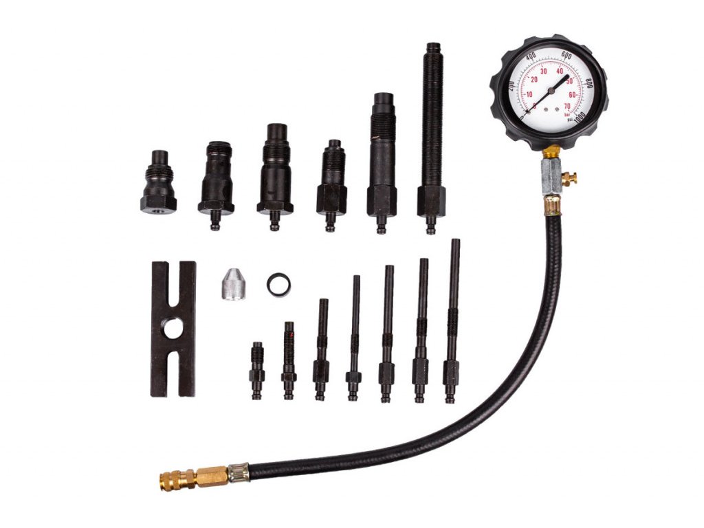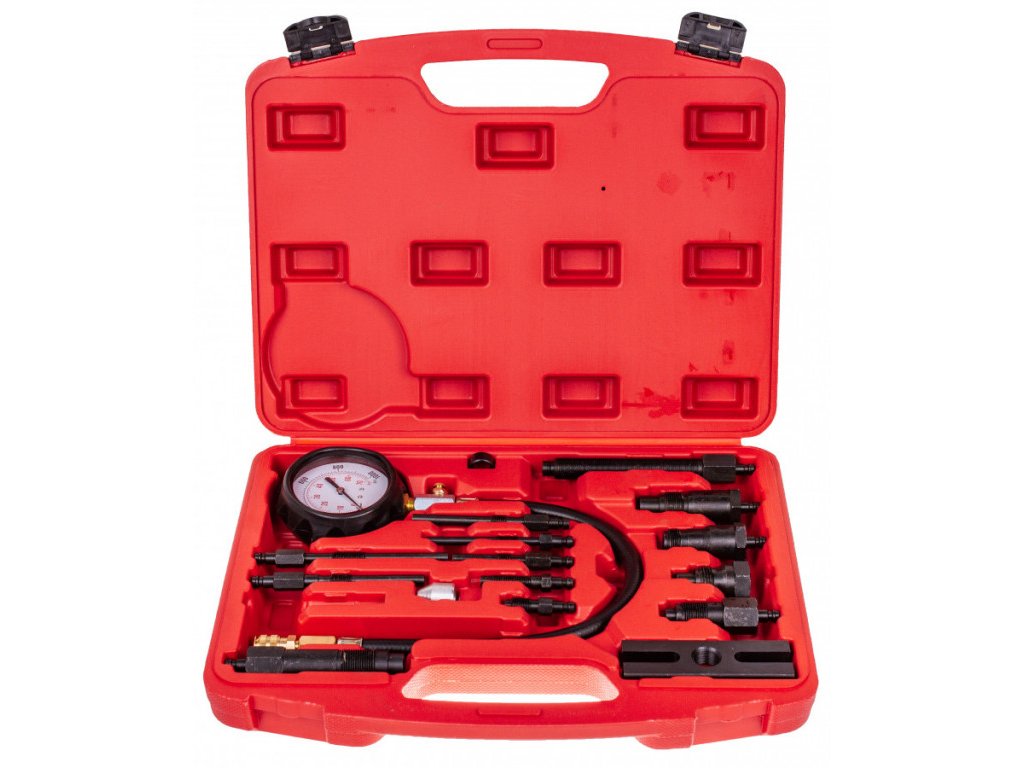 Sada pro měření komprese dieselových motorů s maximální hodnotou 70 bar. Sada obsahuje adaptéry pro připojení měřiče k většině vznětových motorů běžných značek automobilů. Souprava obsahuje manometr s maximálním rozsahem do 70 barů, prodlužovací adaptér, 10 adaptérů pro připojení přes žhavící svíčky motoru,4 adaptéry pro připojení k motoru přes vstřiky a montážní přípravek tvaru H. Vyrobeno z oceli C45. Souprava je uložena v plastovém kufru s prolisy pro snadný přenos a přehledné uložení součástí sady.