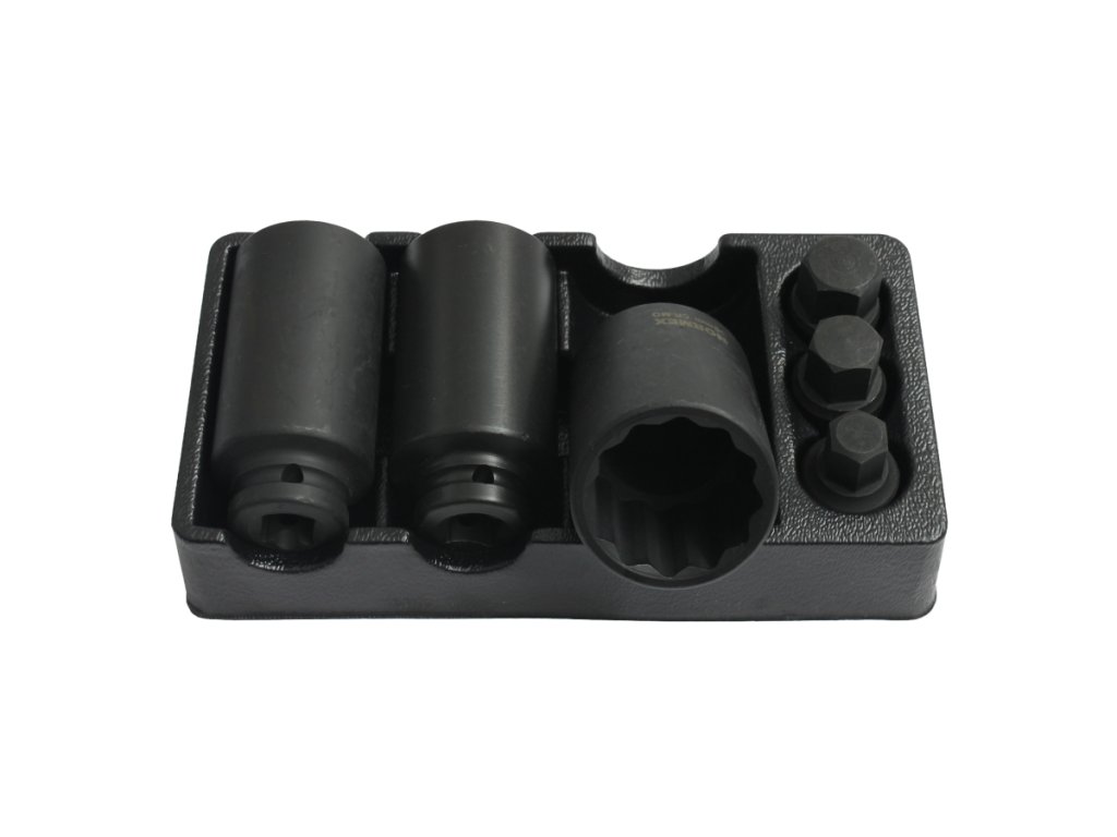 Sada nástavců na poloosy obsahuje vnitřní tisícihranné nástrčné klíče 1/2" (dvanáctihranné/dvojitý šestihranné) v dlouhém provedení o délce 85 mm ve velikostech 30, 32 a 36 mm. V sadě naleznete také krátké vnější nástrčné klíče HEX 1/2" o délce 43 mm ve velikostech H14, H17 a H19. Všechny hlavice jsou v provedení pro rázové utahováky (kované).