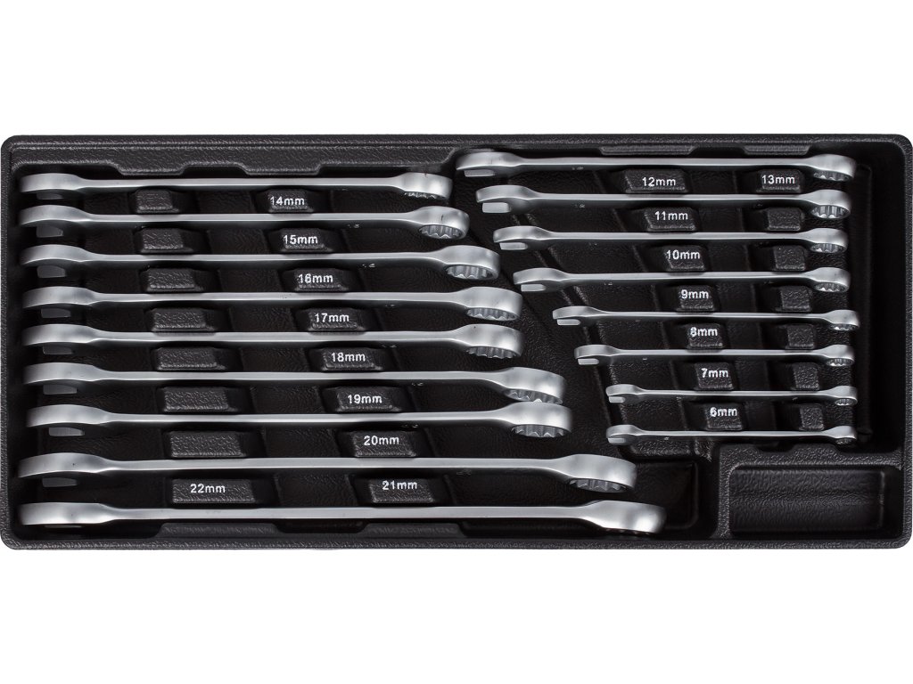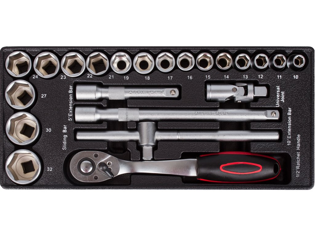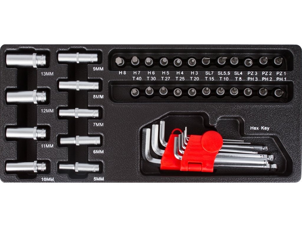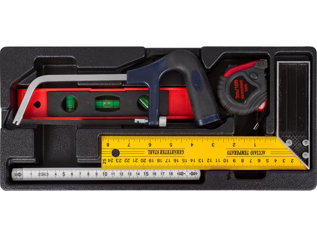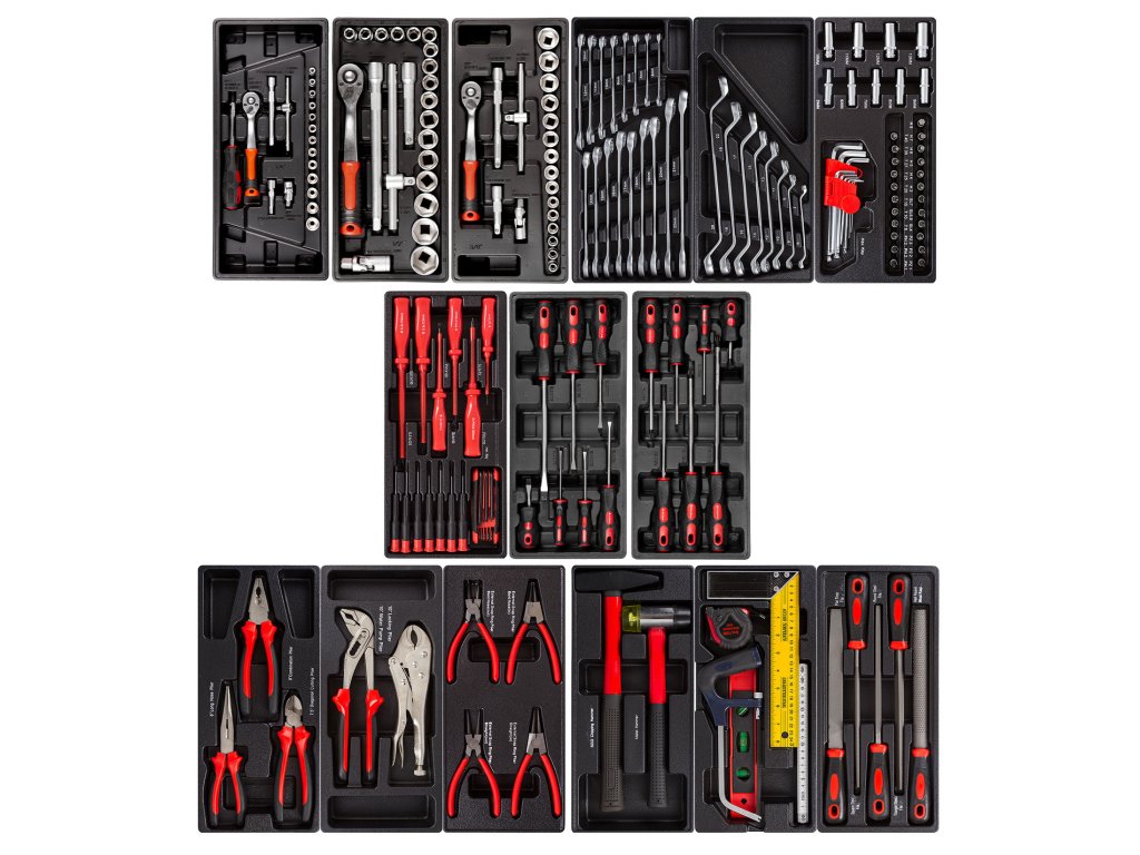 V sadách nářadí naleznete gola sadu 1/4", 3/8" i 1/2", nástrčné klíče, kleště, kladivo a paličku, šroubováky (klasické, elektrikářské i hodinářské), IMBUSy, očkoploché klíče, měřidla a např. rašple a pilníky.
