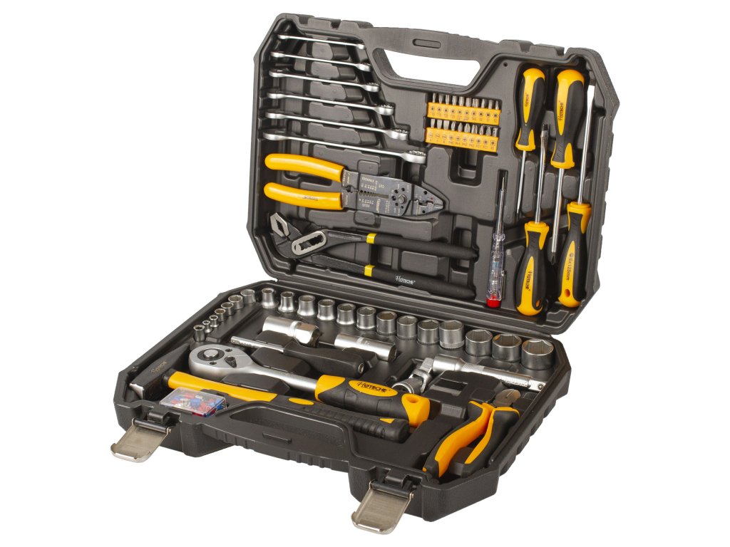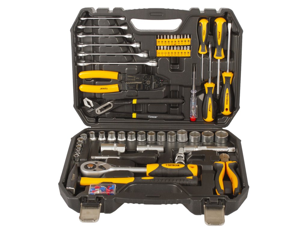 V sadě kromě ráčny 1/2" a příslušných nástrčných klíčů, prodloužení apod. nalezneme také štípací kleště, SIKA kleště, odizolovací kleště, sadu očkoplochých klíčů, křížové i ploché šroubováky, kladivo a další.