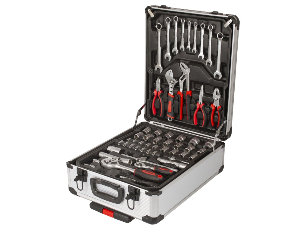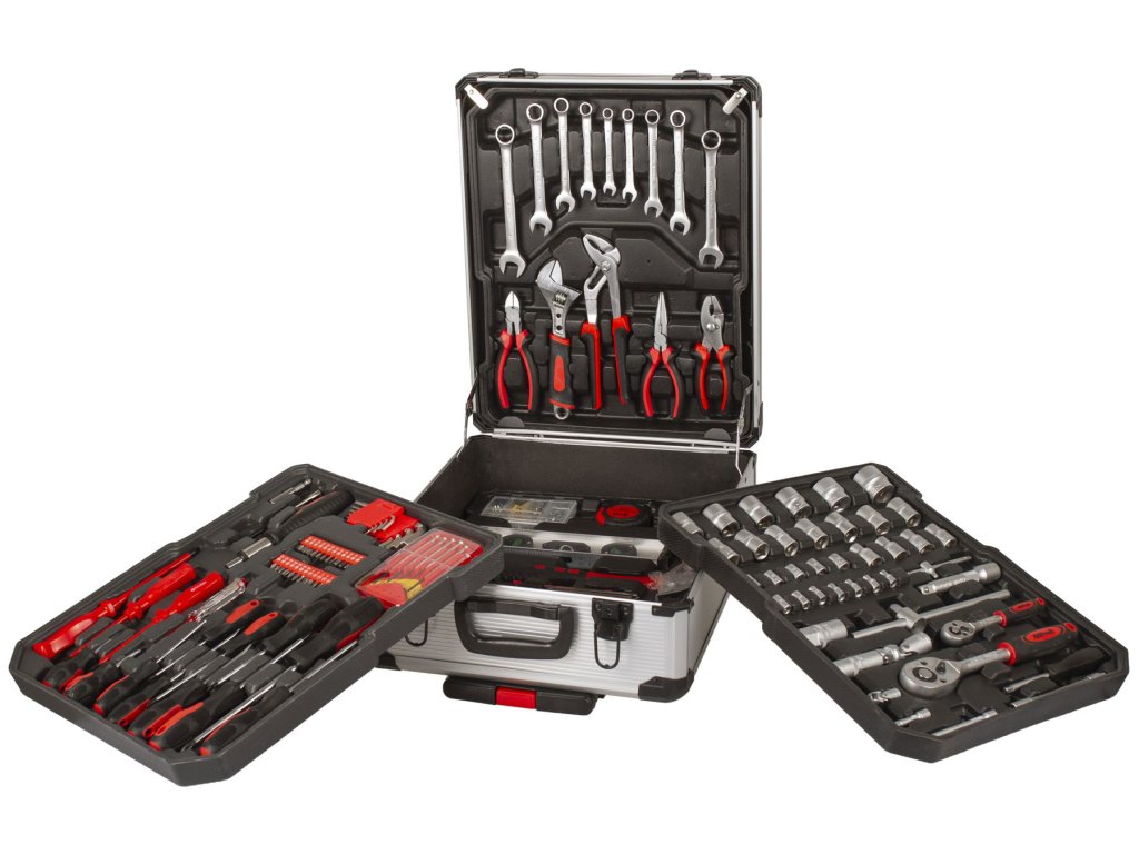 - Sada obsahuje: celou řadu kleští, šroubováků, gola klíčů, kladivo, vodováhu, stranové i imbus klíče, bity, základní spojovací materiál a další nářadí, které je vhodné pro použití jak doma, v garáži, tak i na cestách.