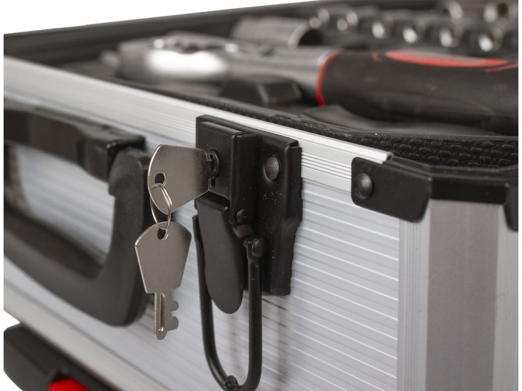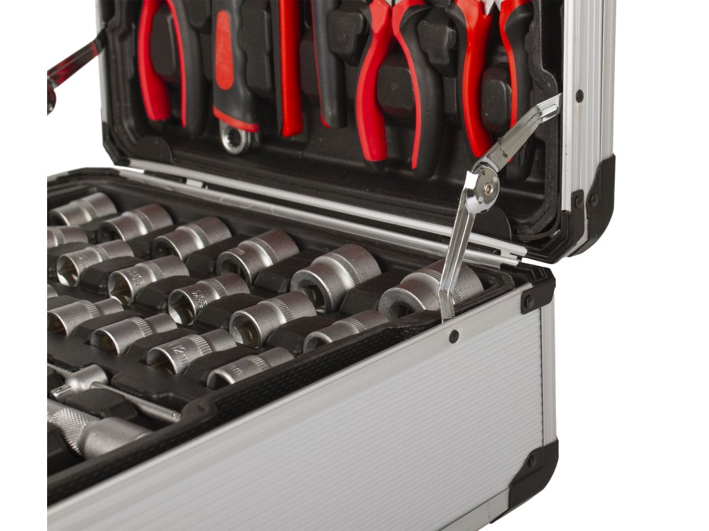 Praktická sada ručního nářadí à la "Bořek stavitel" pro práci všeho druhu. Nářadí ze slitiny Cr-V, které je prakticky uložené ve 4 plastových platech. Toto uložení zrychluje orientaci v nářadí, usnadňuje práci a zaručuje perfektní přehled o chybějícím nářadí. Kufr je uzamykatelný a dodáván i s náhradním klíčem.