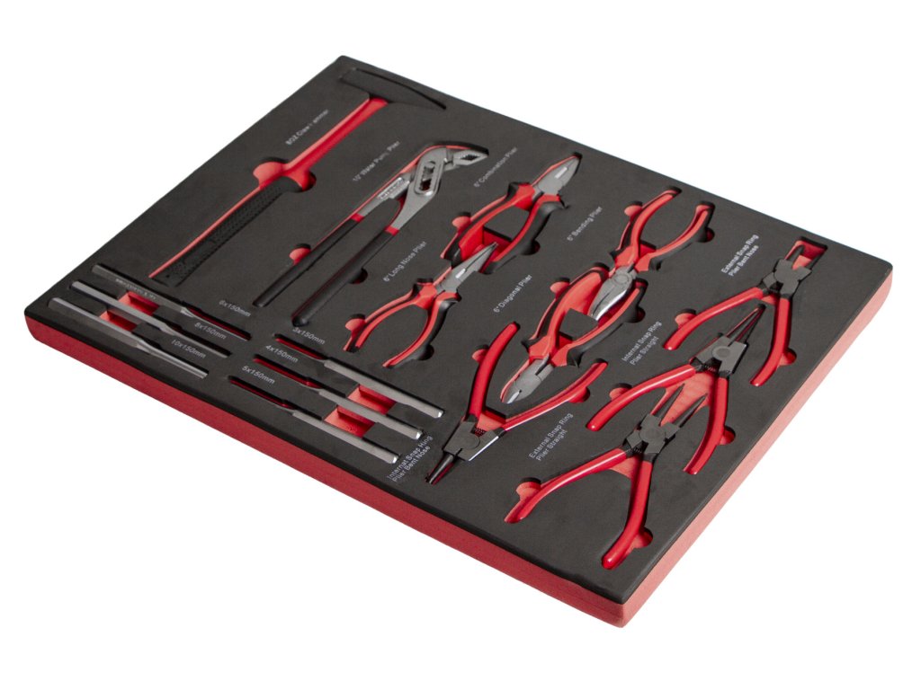 Univerzální sada kleští, vyrážečů a kladiva přehledně uložená v přesně tvarované pěnové výplni, kompatibilní s běžnými dílenskými vozíky.