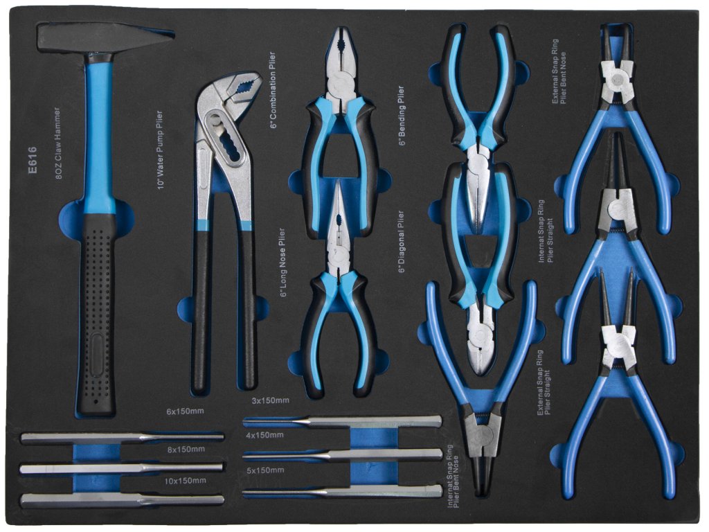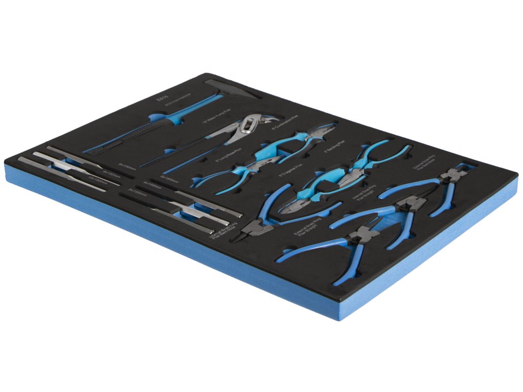 Univerzální sada kleští, vyrážečů a kladiva přehledně uložená v přesně tvarované pěnové výplni, kompatibilní s běžnými dílenskými vozíky.