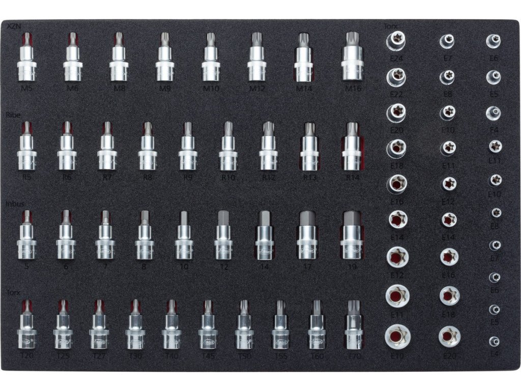 Sada nástrčných klíčů a hlavic s bity ve výplni do dílenských vozíků, 64 dílů - V2837