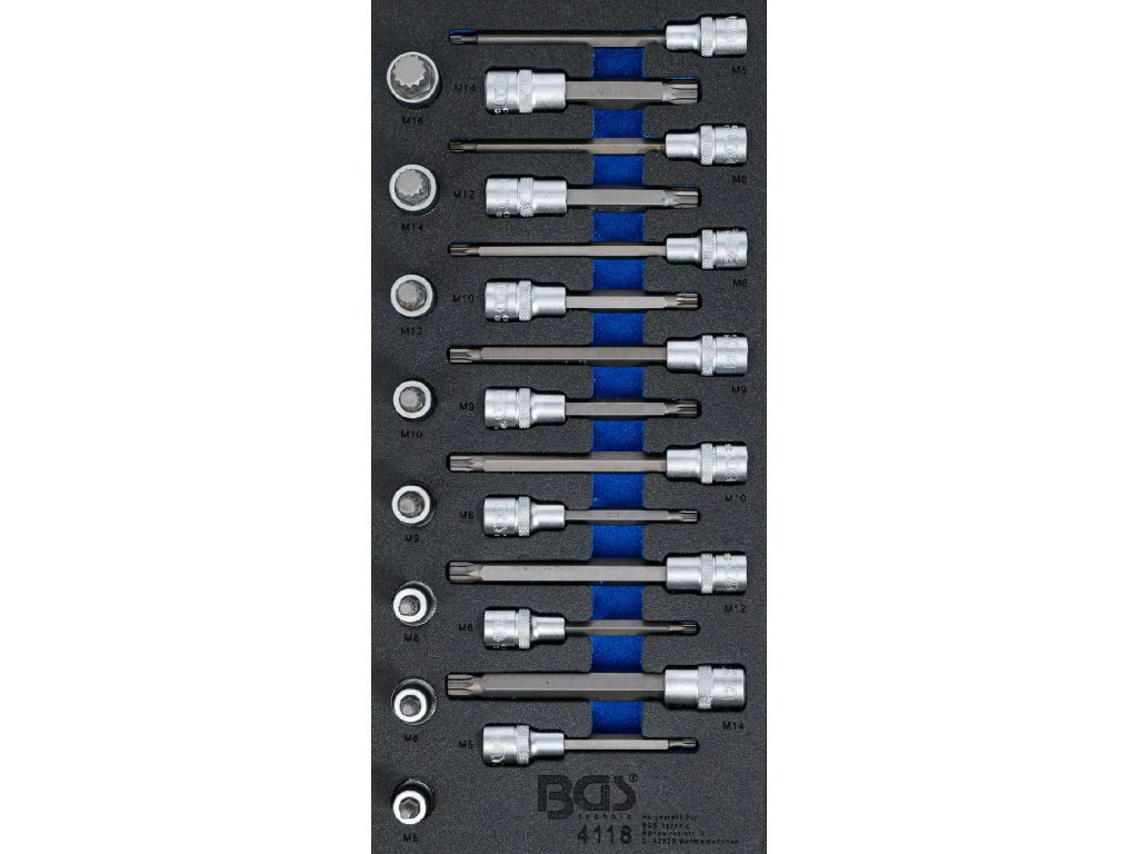 Pěnová vložka o rozměrech (š x h x v) 189 x 408 x 32 mm obsahuje celkem 22 ks nástrčných klíčů tisícihran XZN o velikostech M5 - M16.
