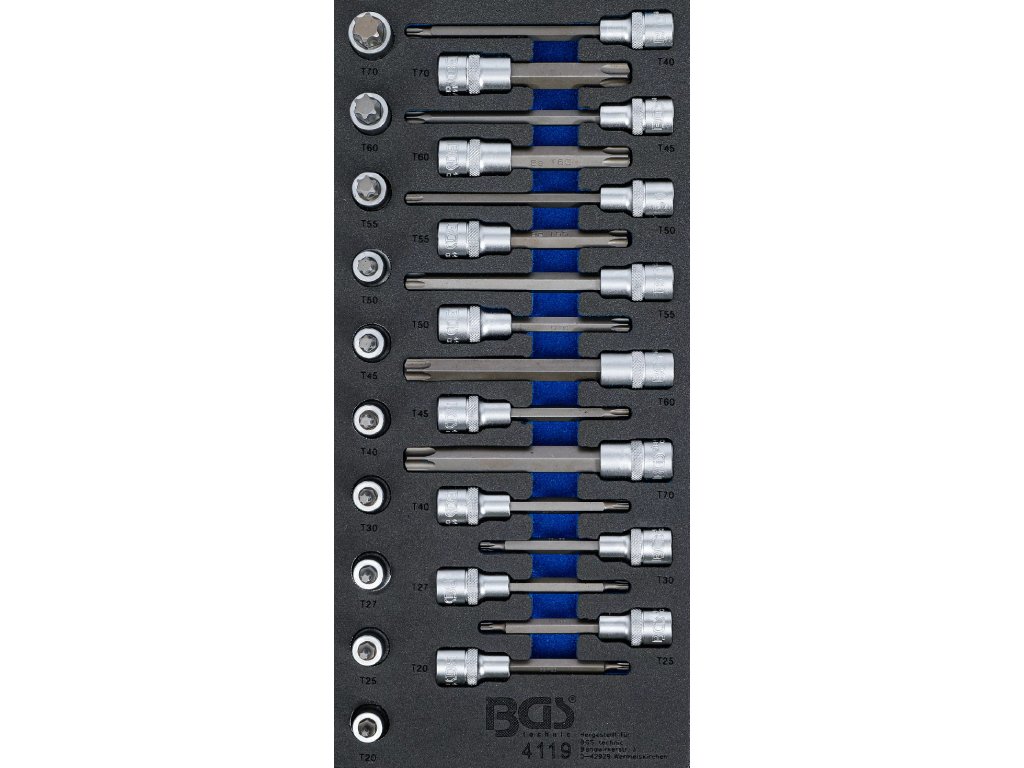 Pěnová vložka o rozměrech (š x h x v) 189 x 408 x 32 mm obsahuje celkem 26 ks nástrčných klíčů Torx o velikostech T20 - T60.