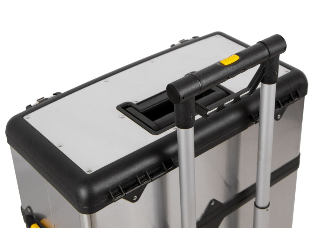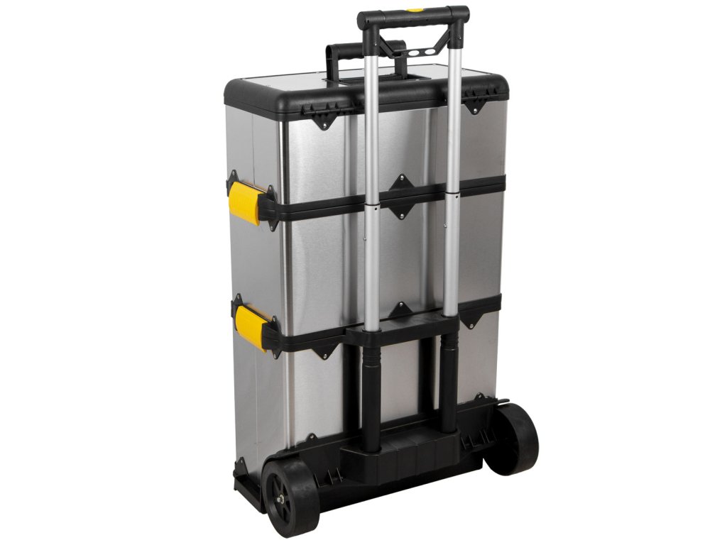 V horní části kufrů se nachází madlo pro pohodlné přenášení a spodní kufr je osazen gumovými kolečky a teleskopickým madlem s výškou až 98 cm.