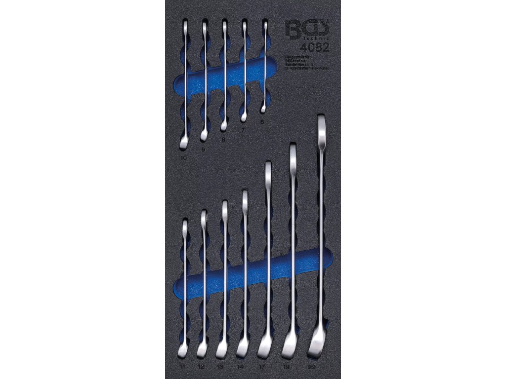 Pěnová vložka o rozměrech (š x h x v) 189 x 408 x 32 mm obsahuje celkem 12 ks kvalitních očkoplochých klíčů o velikostech 6 - 22 mm.