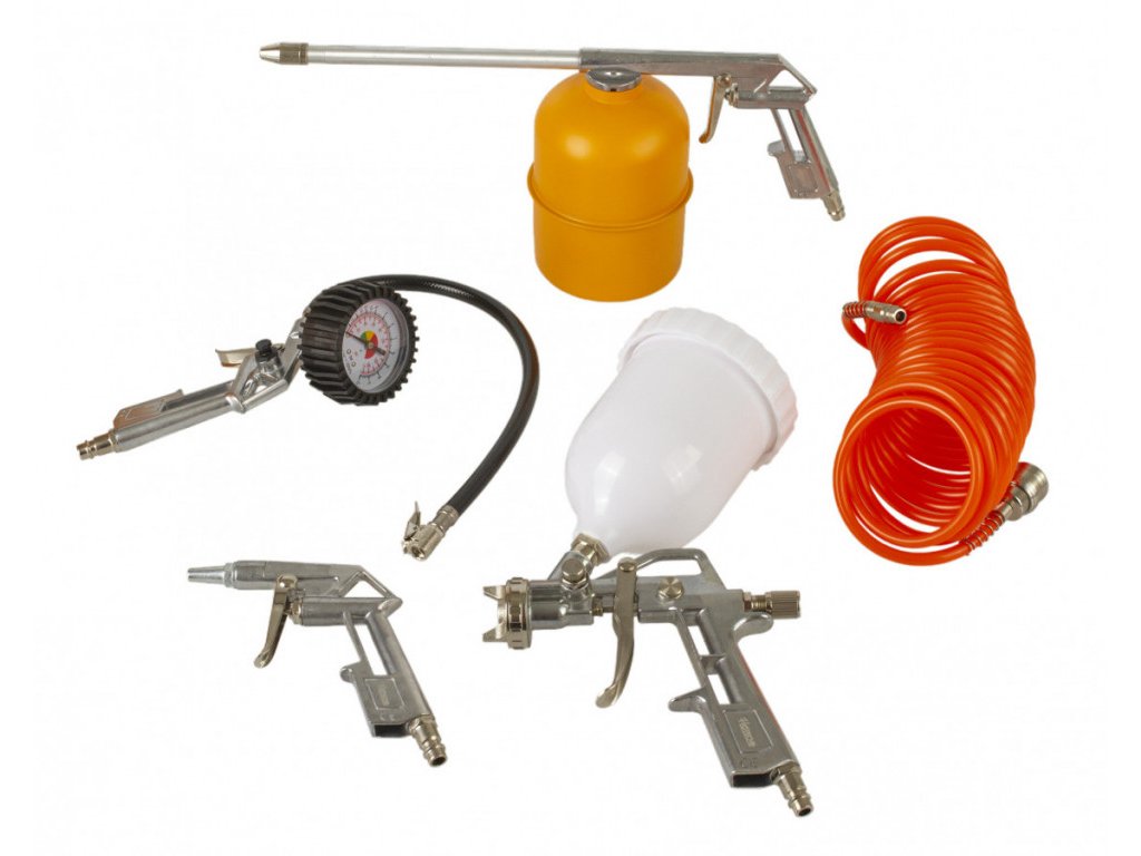 V sadě naleznete ofukovací pistoli, mycí (mlžící) pistoli, hustič pneu, pistoli na lakování a vzduchovou hadici o délce 5 m.