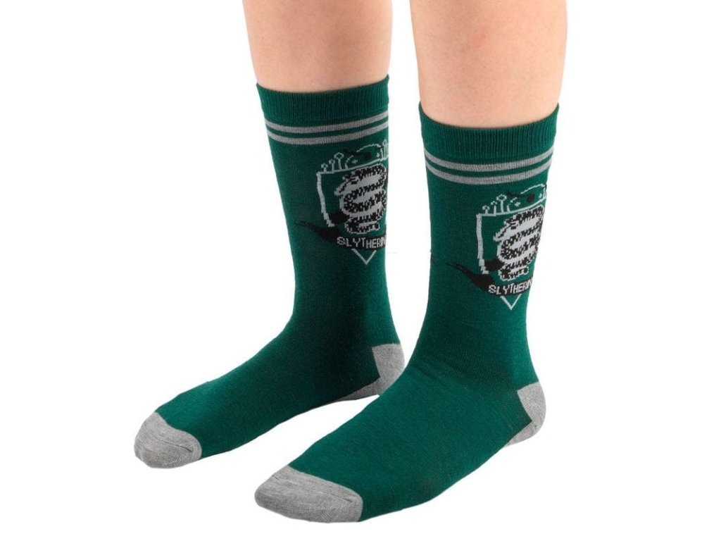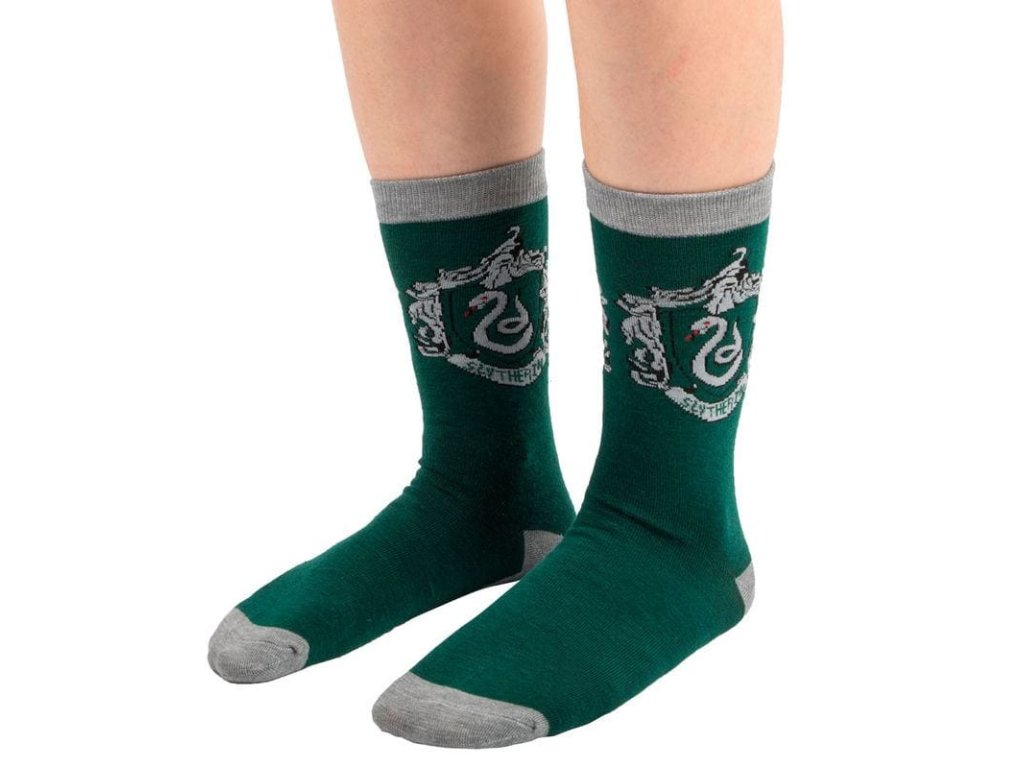Sada obsahuje 3 páry zelených ponožek s různými vzory podle bradavického Zmijozelu, nutnost pro všechny věrné studenty této koleje! Skvělý doplněk oblečení pro fanoušky příběhů o Harrym Potterovi. Vhodné pro velikosti 35 až 45.Doplňkové parametry