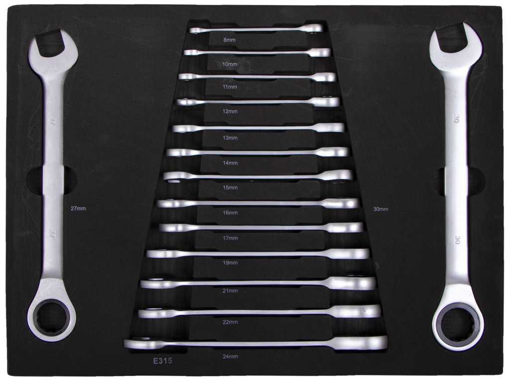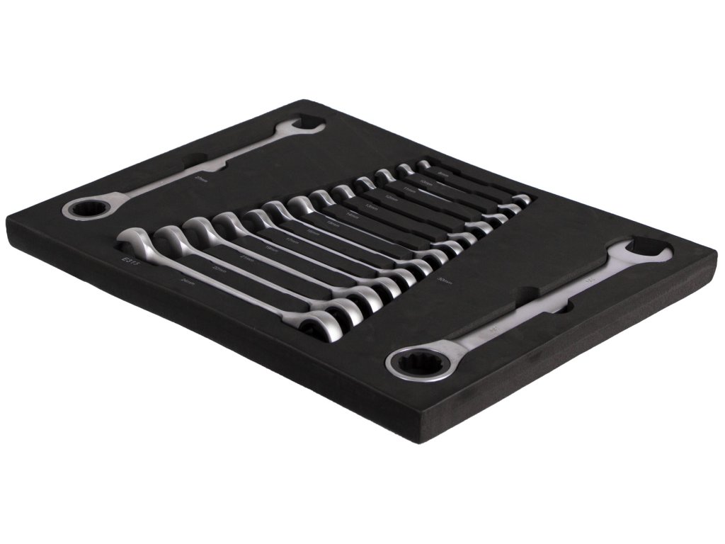 Sada 15 ks ráčnových očkoplochých klíčů v pěnové výplni do dílenského vozíku o velikostech: